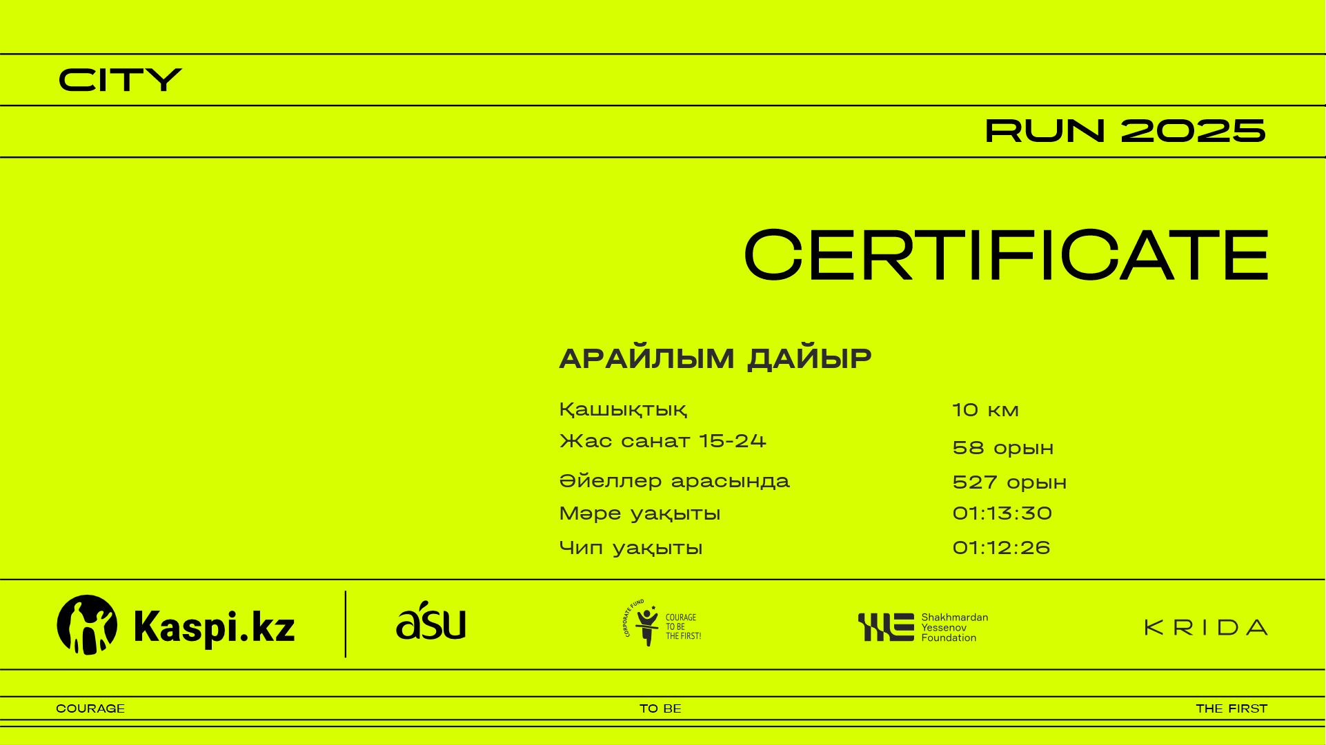 | 727 | Aliza Beisen | ![]() | Almaty | 2462 | 00:15:45 | 00:25:40 | 00:36:00 | 00:46:25 | 00:54:34 | 00:55:49 | 00:54:29 | Жүктеп алу |