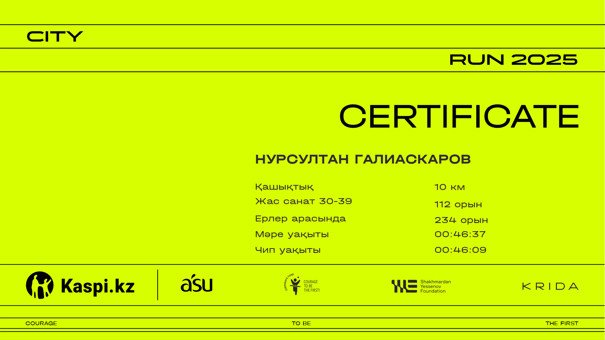 ОрынҚатысушыЕлҚалаНөмір2.52 km4.37 km6.4 km8.43 km9.84 kmФинишУақыт чипіСертификат
