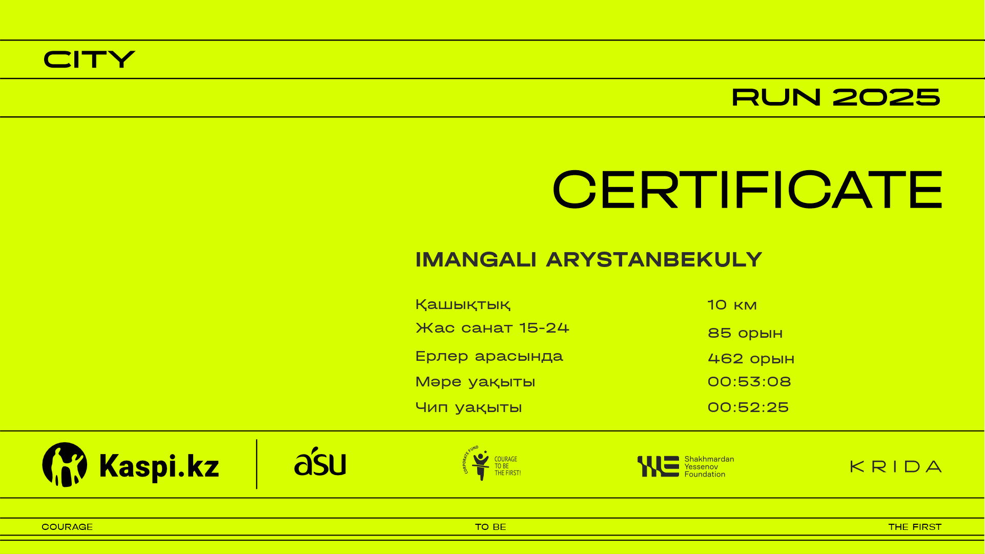 | 555 | Imangali Arystanbekuly | ![]() | Алматы | 1005 | 00:14:39 | 00:24:11 | 00:34:30 | 00:44:39 | 00:52:00 | 00:53:08 | 00:52:25 | Жүктеп алу |