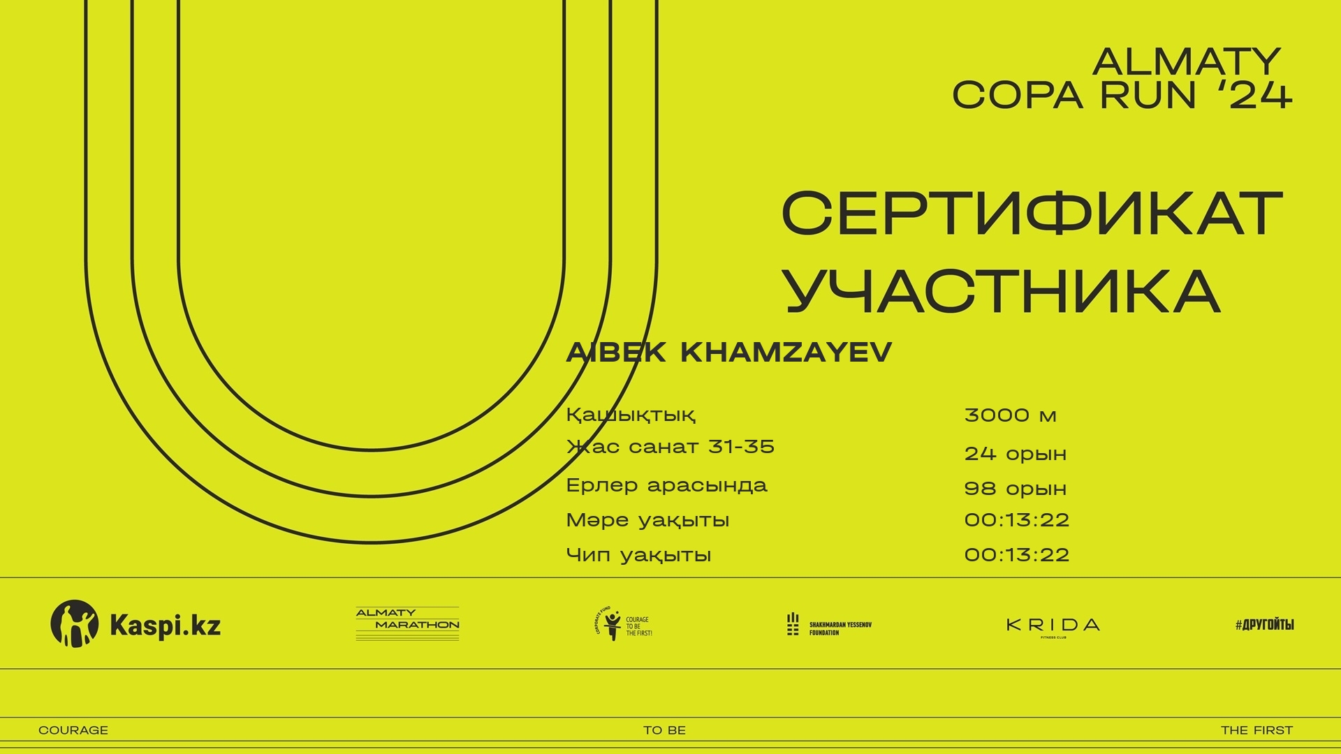 | 112 | Aibek Khamzayev | ![]() | Алматы | 567 | 00:13:22.0 | Жүктеп алу |