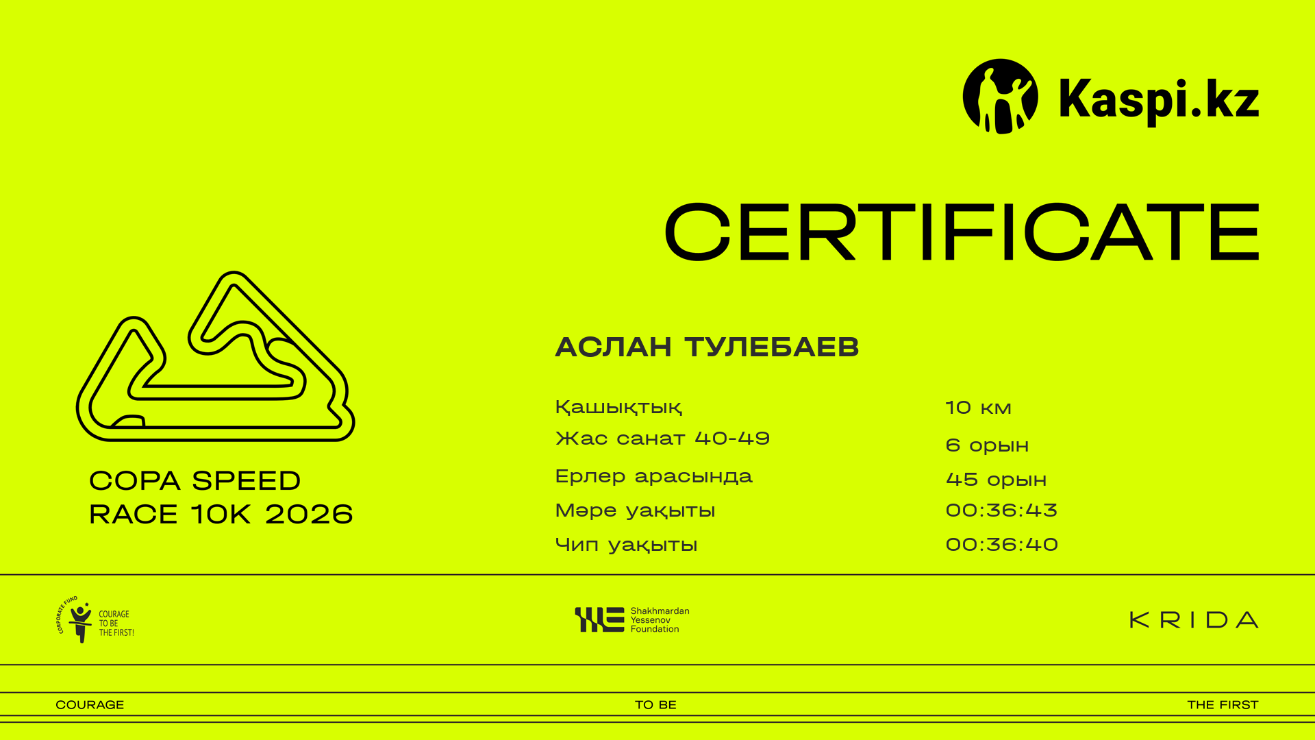 | 49 | Дидар Халықбай | ![]() | Алматы | 258 | 00:07:33.39 | 00:14:01.61 | 00:18:26.76 | 00:26:01.44 | 00:32:36.93 | 00:36:48.78 | 00:36:46.31 | Жүктеп алу |