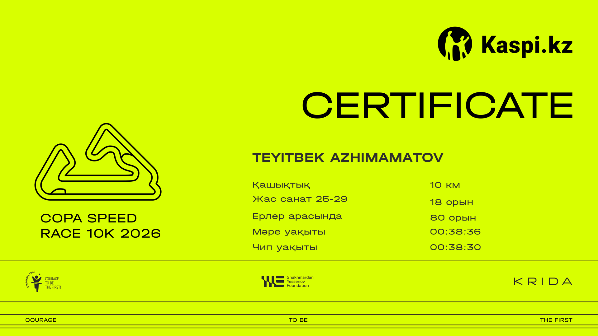 | 86 | Еспембет жанбабаев | ![]() | Алматы | 260 | 00:07:44.66 | 00:14:26.97 | 00:19:11.27 | 00:27:28.00 | 00:34:20.04 | 00:38:53.47 | 00:38:52.63 | Жүктеп алу |