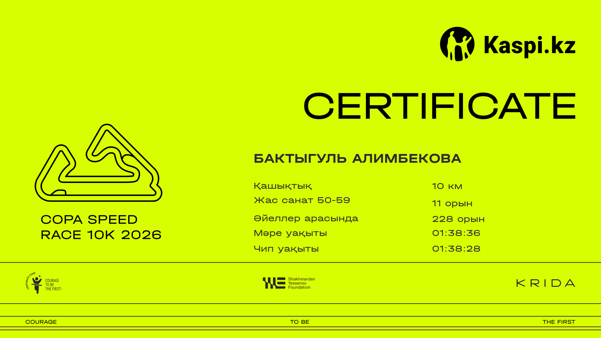 | 808 | Бактыгуль Алимбекова | ![]() | Алматы | 1246 | 00:19:12.91 | 00:35:47.25 | 01:08:07.61 | 01:26:29.56 | 01:38:36.55 | 01:38:28.97 | Жүктеп алу | |