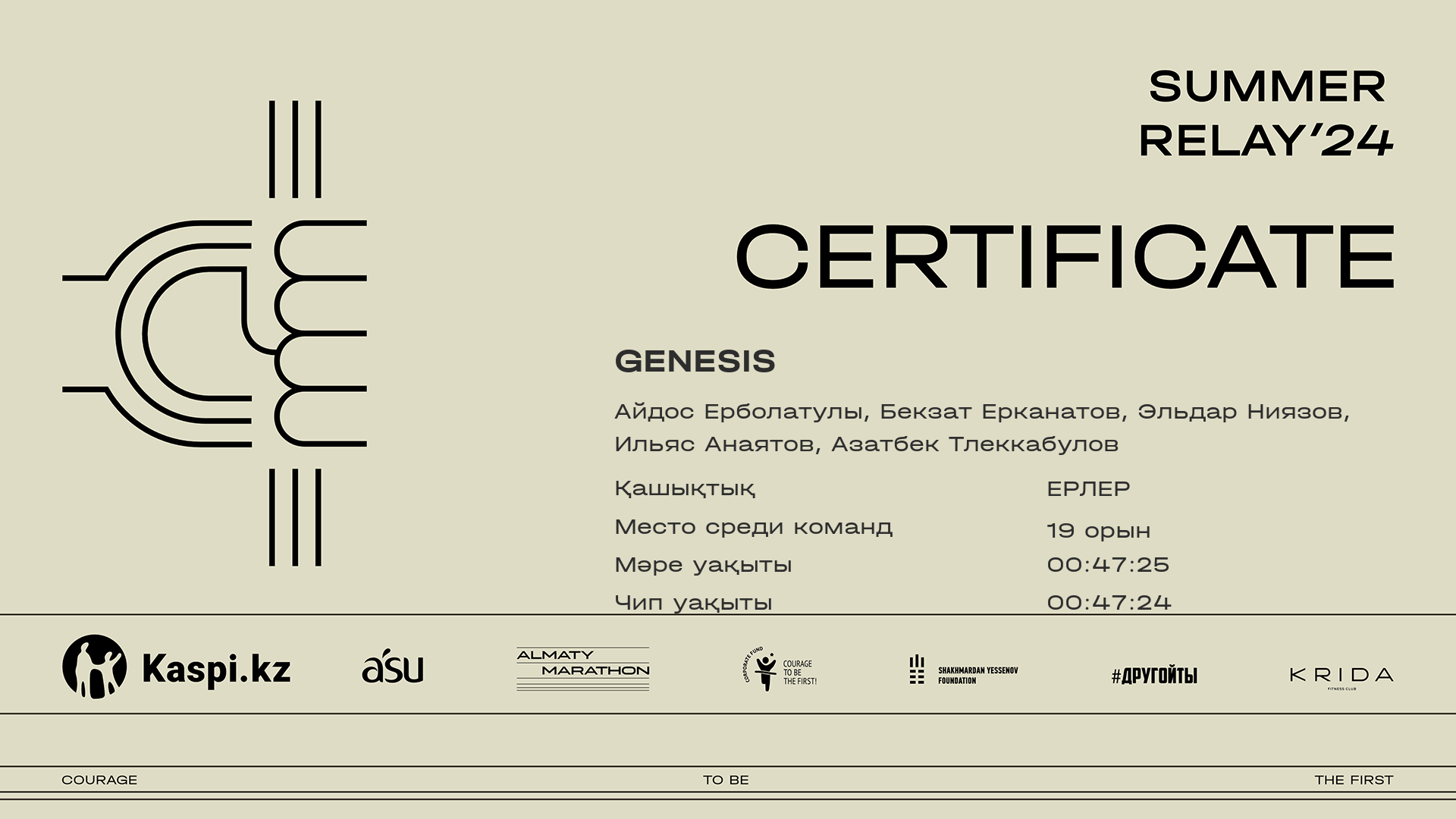 | 20 | Kaspi Run: Aleksandr Solodun, Almurat Zhilkamanov, Берик Кожамжаров, Арман Букенов, Руслан Дубинин |  | Алматы | 15 | 00:09:37.69 | 00:08:30.88 | 00:11:45.45 | 00:09:39.13 | 00:47:37.89 | 00:47:35.83 | Жүктеп алу |
