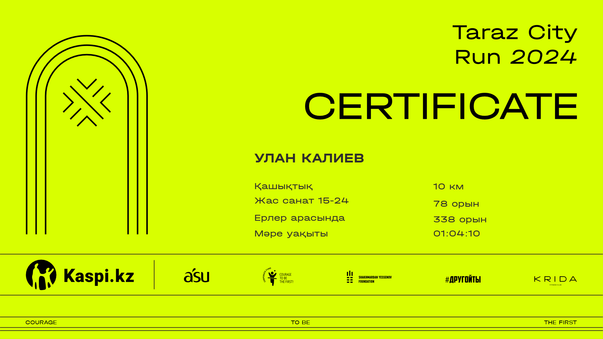 | 434 | Улан Калиев | ![]() | Алматы | 159 | 00:15:29.10 | 00:32:29.30 | 00:48:04.70 | 01:04:10.60 | 01:03:57.40 | Жүктеп алу |