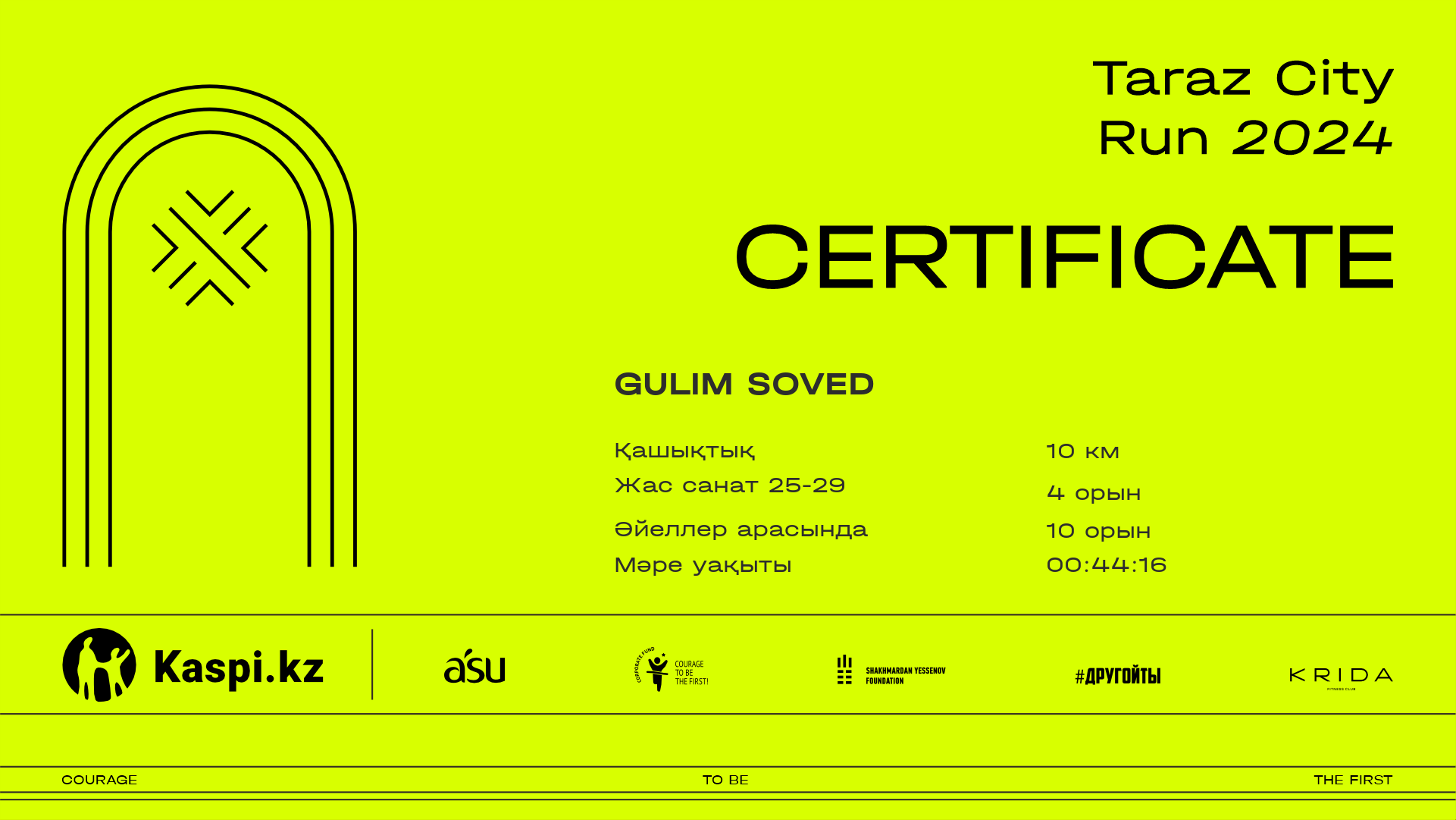 | Орын | Қатысушы | Ел | Қала | Нөмір | 2.5 km | 5 km | 7.5 km | Финиш | Уақыт чипі | Сертификат |