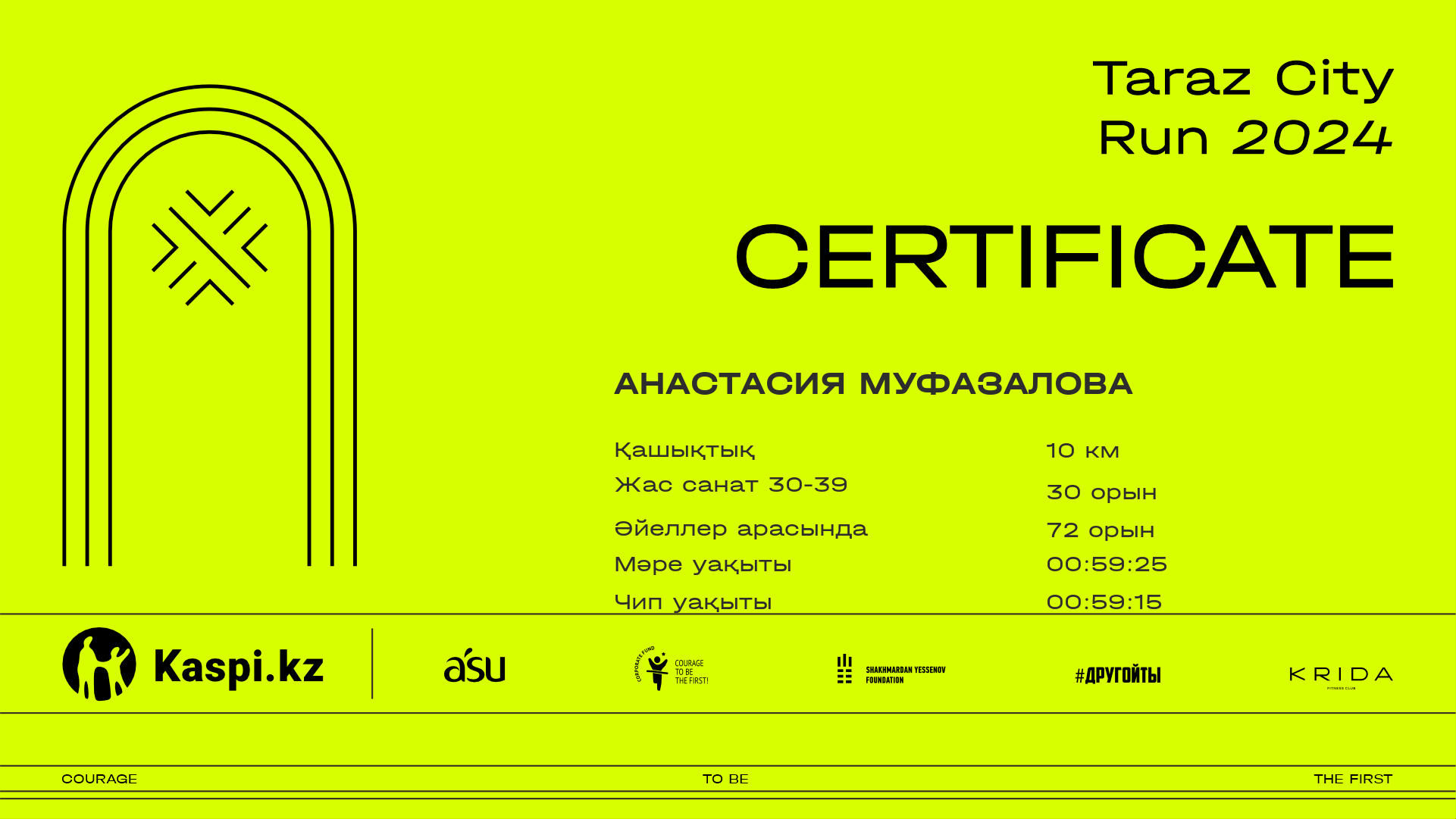 | 345 | Арман Жанесенов | ![]() | Тараз | 162 | 00:12:26.30 | 00:26:26.00 | 00:42:37.40 | 00:57:37.00 | 00:57:33.70 | Жүктеп алу |