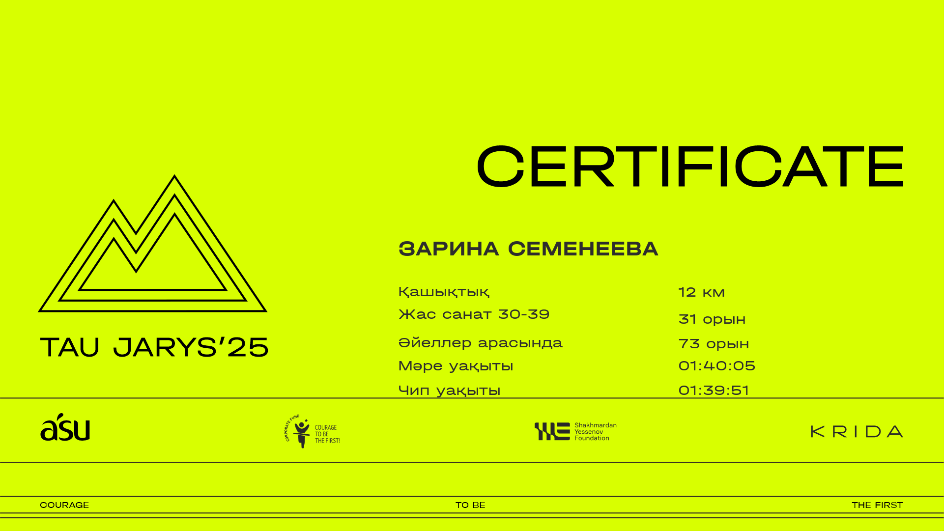 | 390 | Зарина Семенеева | ![]() | Алматы | 211 | 00:12:29.50 | 00:30:19.40 | 00:39:25.10 | 01:00:22.70 | 01:21:17.90 | 01:31:07.50 | 01:40:05.70 | 01:39:51.50 | Жүктеп алу |