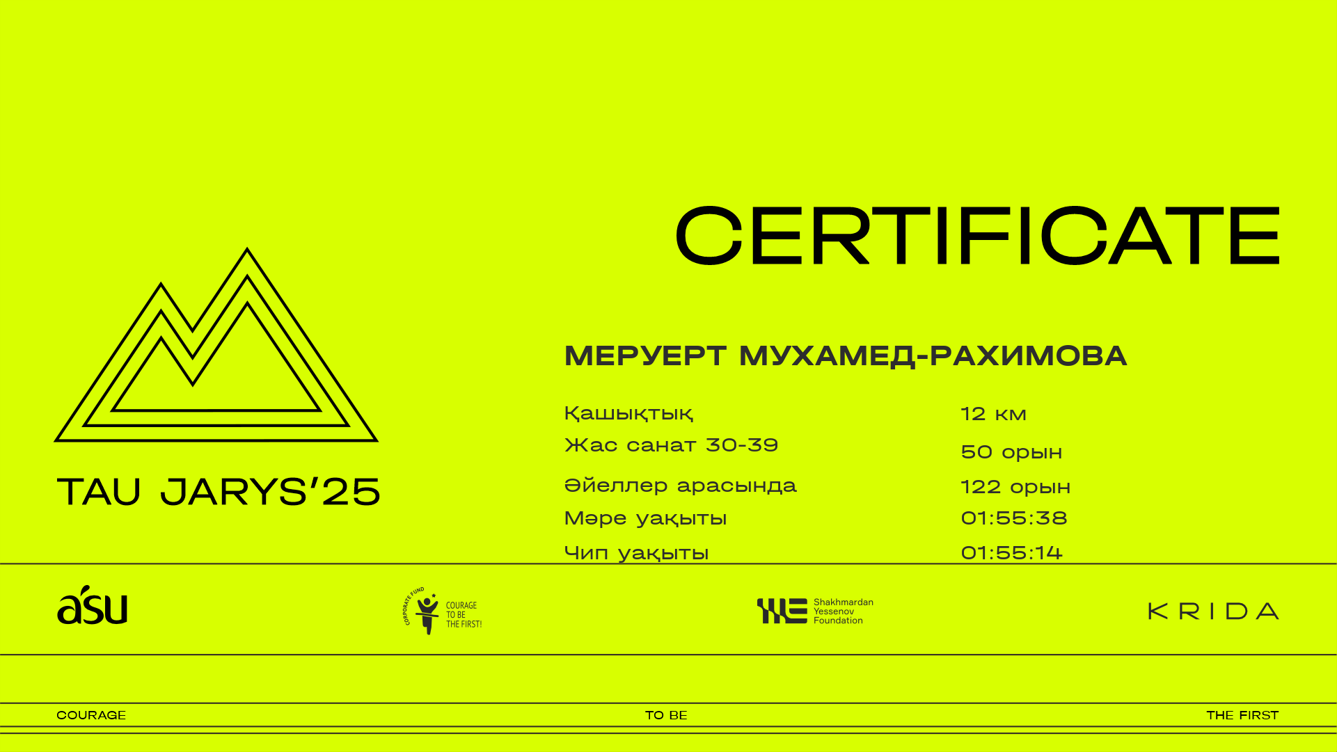 | 489 | Меруерт Мухамед-Рахимова | ![]() | Алматы | 1 | 00:13:29.60 | 00:34:59.70 | 00:45:49.30 | 01:09:59.00 | 01:33:55.10 | 01:45:19.60 | 01:55:38.40 | 01:55:14.60 | Жүктеп алу |