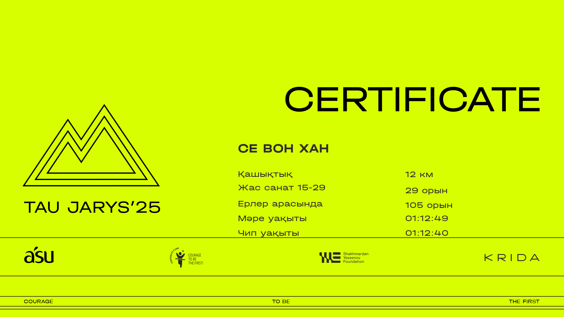 | 211 | Артём Григорчук | ![]() | Алматы | 22 | 00:09:10.20 | 00:24:04.70 | 00:32:01.10 | 00:49:22.20 | 01:06:11.20 | 01:14:19.00 | 01:21:16.80 | 01:21:14.00 | Жүктеп алу |