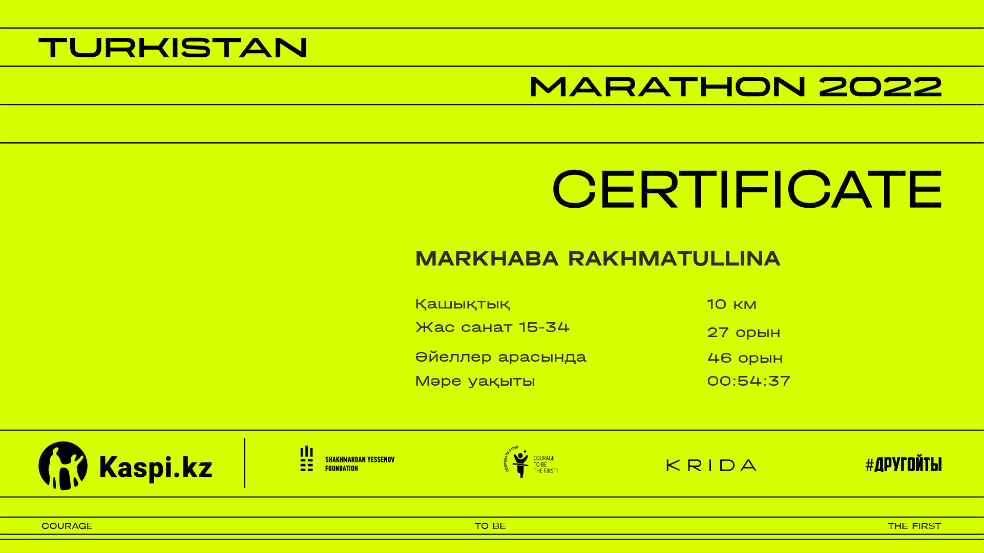 | 212 | Markhaba Rakhmatullina | ![]() | Алматы | 871 | 00:27:00.64 | 00:54:37.94 | 00:54:37.94 | Жүктеп алу |