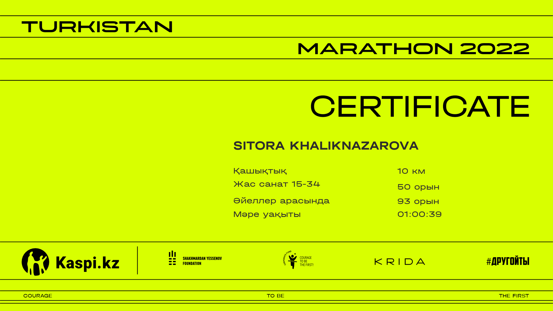 | 343 | SITORA KHALIKNAZAROVA | ![]() | Шымкент | 1373 | 00:30:03.75 | 01:00:39.72 | 01:00:34.07 | Жүктеп алу |
