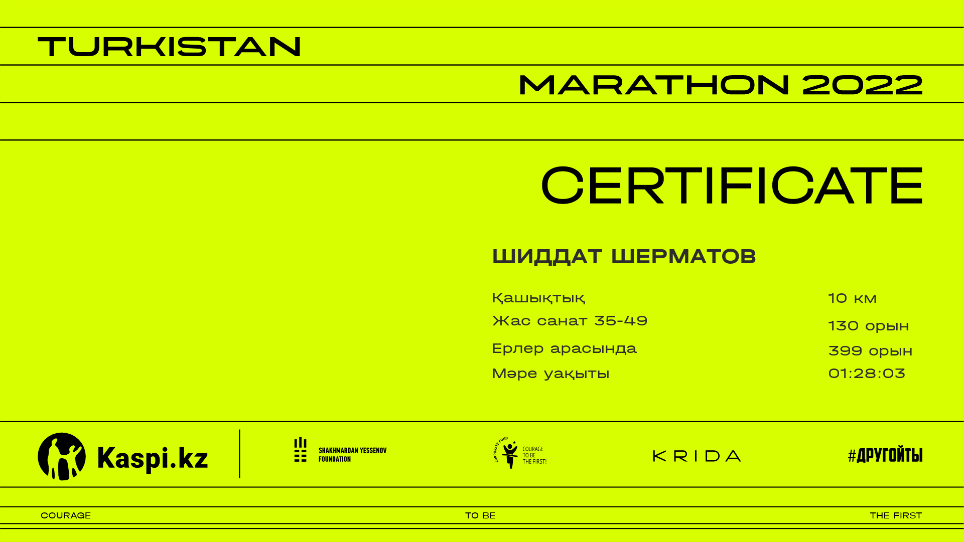 | 709 | Шиддат Шерматов | ![]() | Алматы | 957 | 00:42:37.88 | 01:28:03.22 | 01:27:45.47 | Жүктеп алу |