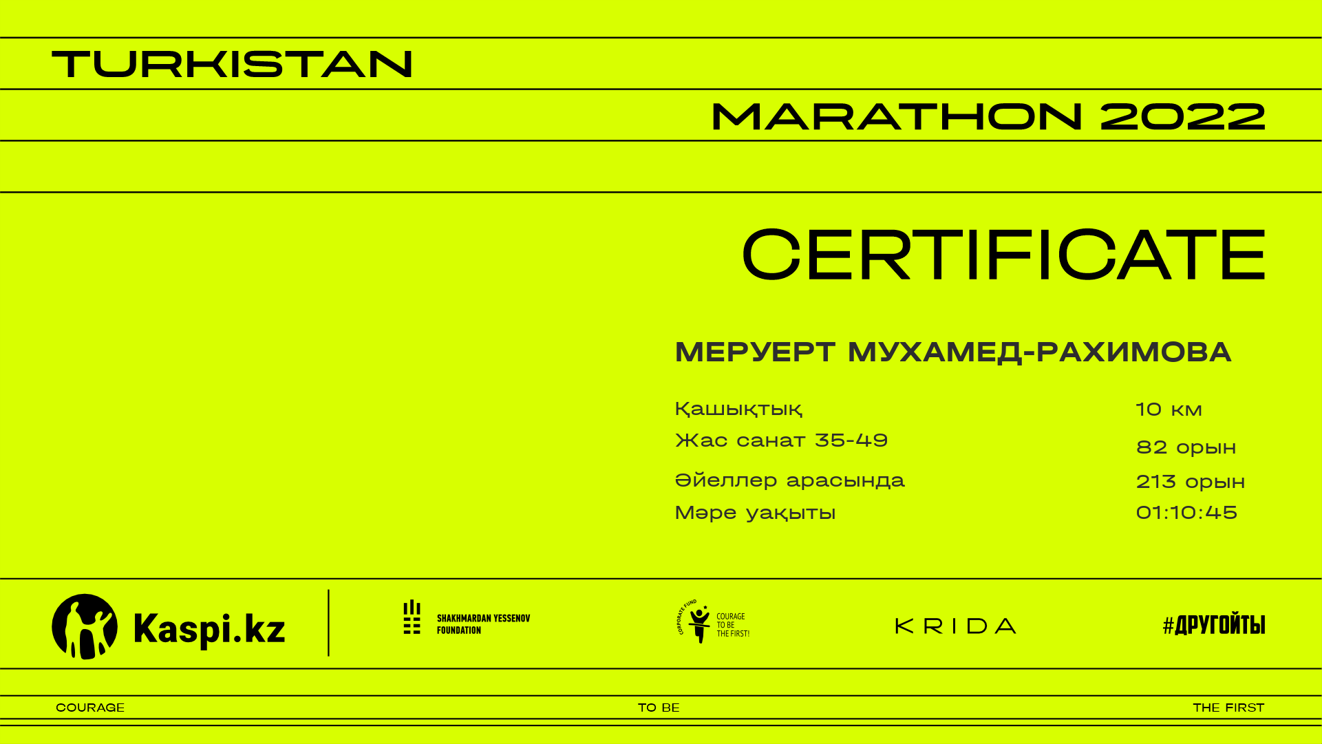 | 557 | Меруерт Мухамед-Рахимова | ![]() | Алматы | 833 | 00:36:01.85 | 01:10:45.75 | 01:10:25.28 | Жүктеп алу |