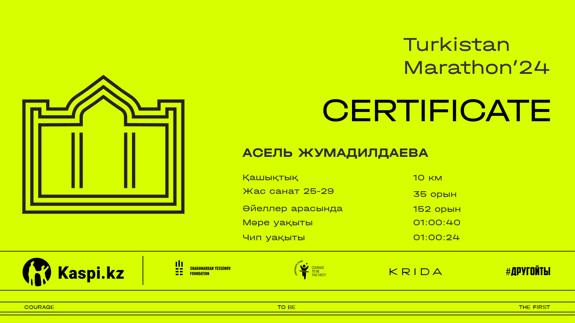 | 1025 | Асель Избасова | ![]() | Астана | 1270 | 00:37:50 | 01:15:38 | 01:15:04 | Жүктеп алу |