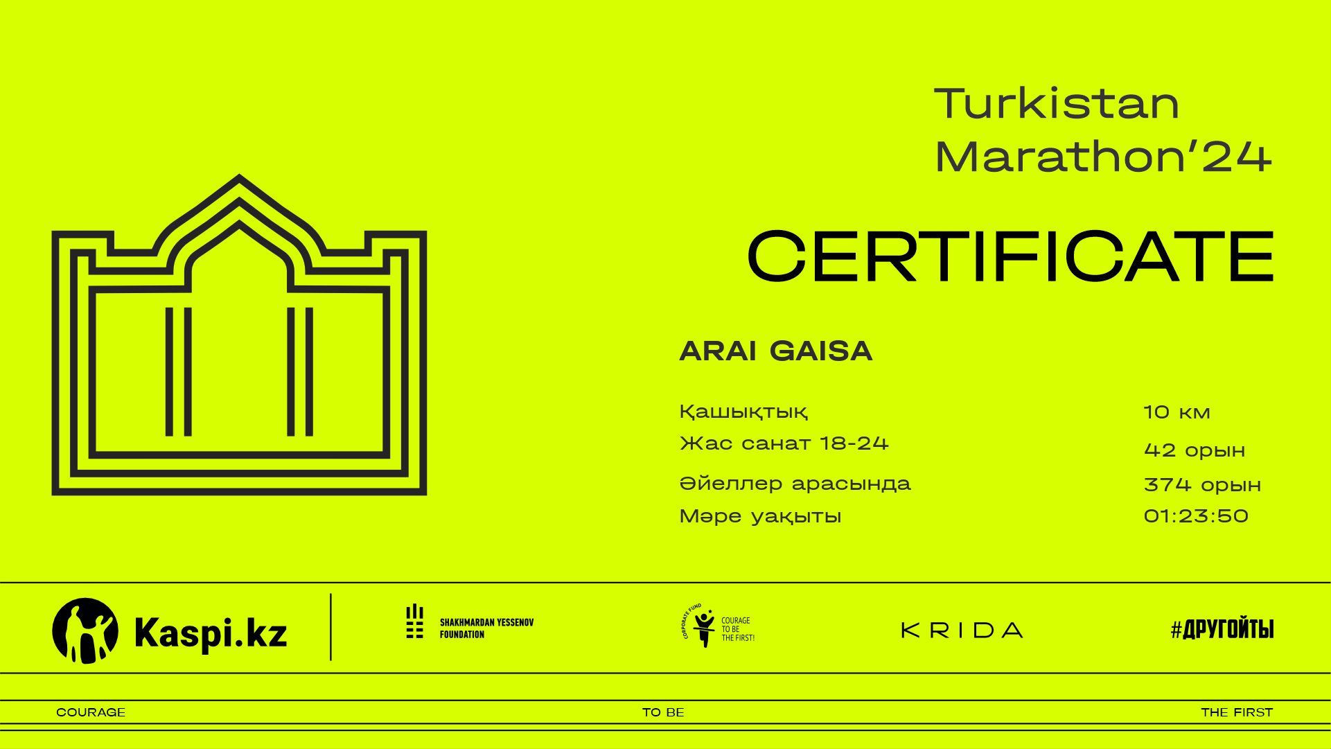 | 1135 | Наргиза Нуралиева | ![]() | Шымкент | 1761 | 00:42:05 | 01:24:02 | 01:23:07 | Жүктеп алу |