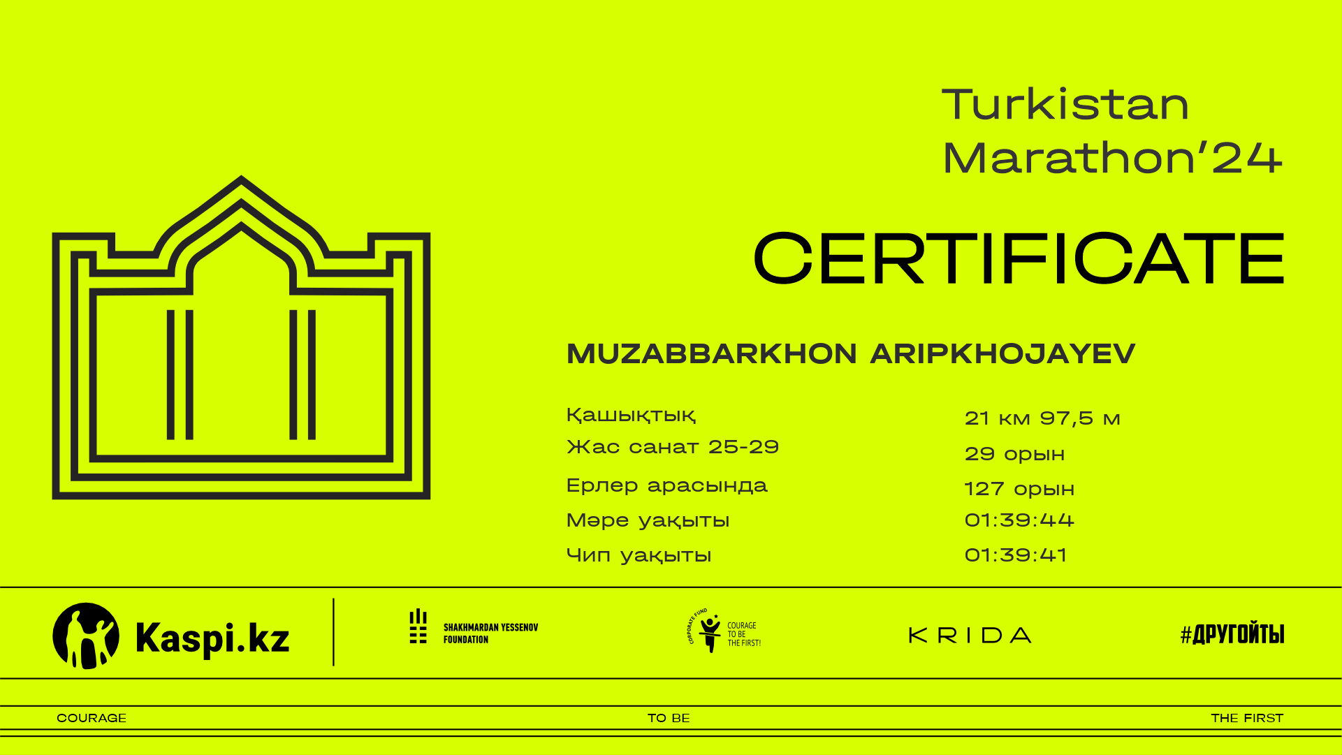 | 140 | Muzabbarkhon Aripkhojayev | ![]() | Шымкент | 635 | 00:23:52 | 00:50:22 | 01:16:24 | 01:39:44 | 01:39:41 | Жүктеп алу |