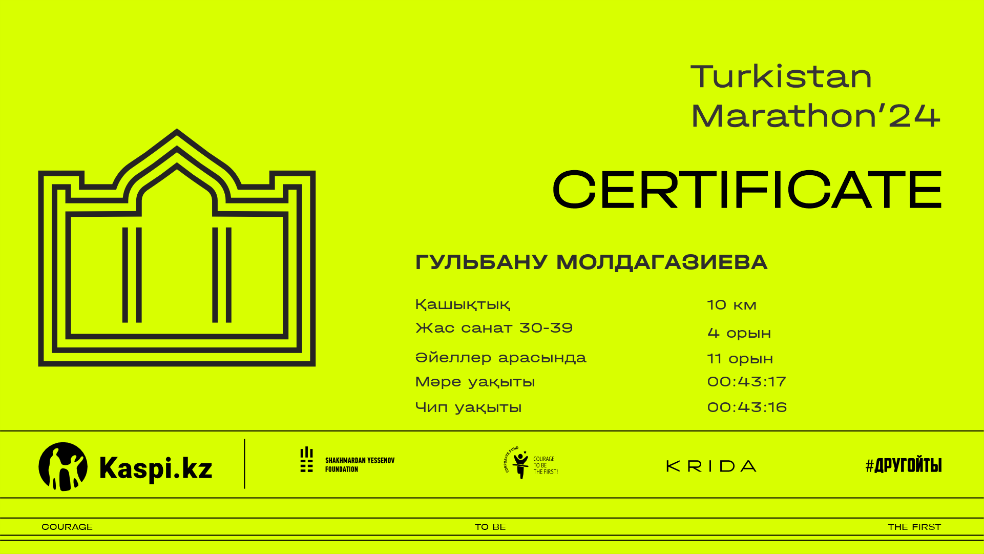 | 727 | Аяулым Сыдыкова | ![]() | Алматы | 1768 | 00:32:38 | 01:03:44 | 01:02:49 | Жүктеп алу |
