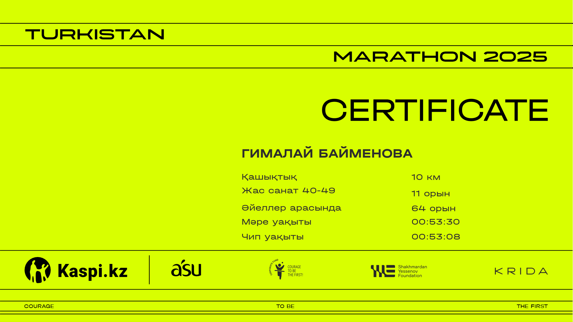 ОрынҚатысушыЕлҚалаНөмір6.25 kmФинишУақыт чипіСертификат