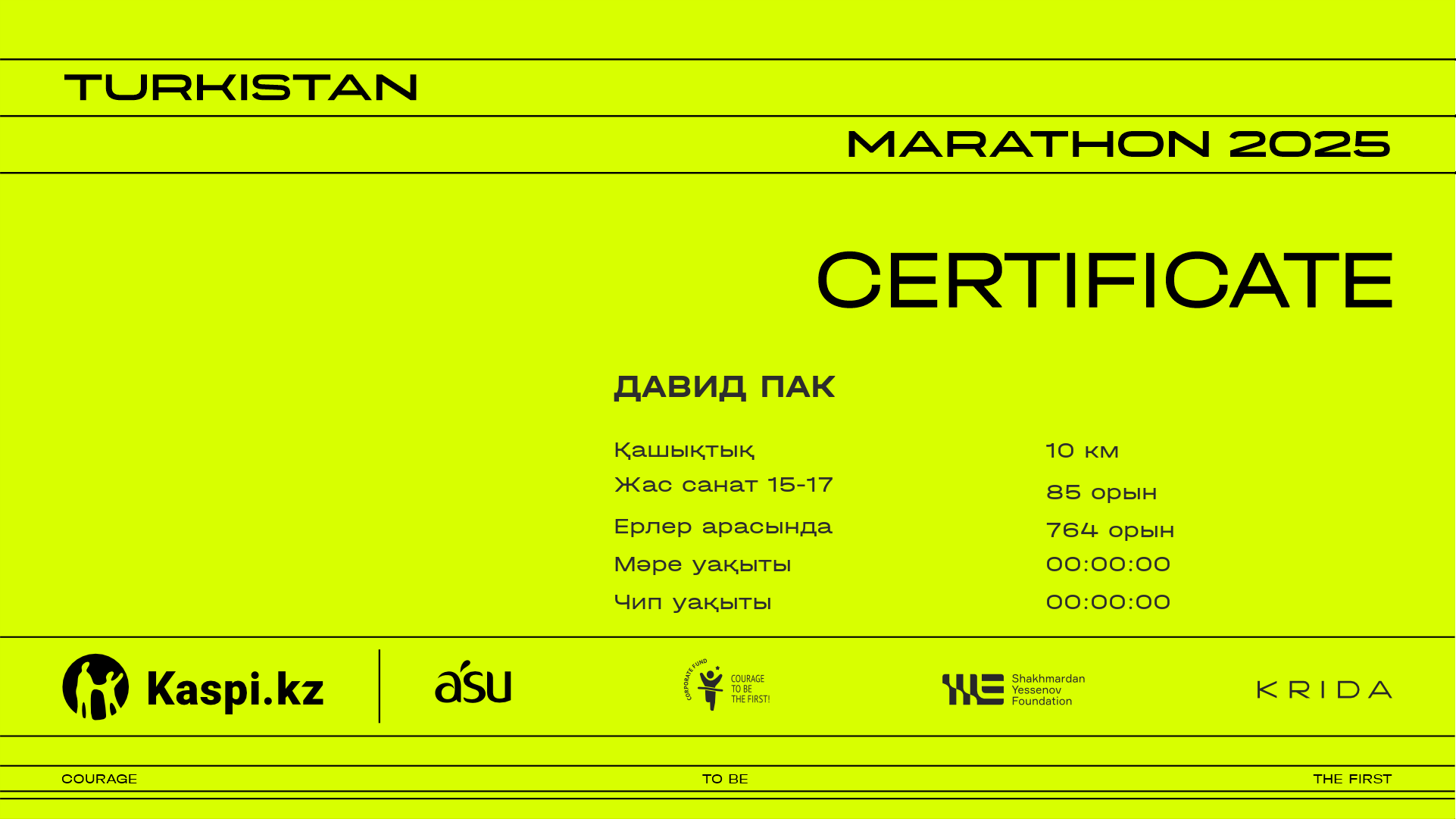 | 61 | Artem Pavlenko | ![]() | Алматы | 1425 | 00:25:02 | 00:39:48 | 00:39:35 | Жүктеп алу |