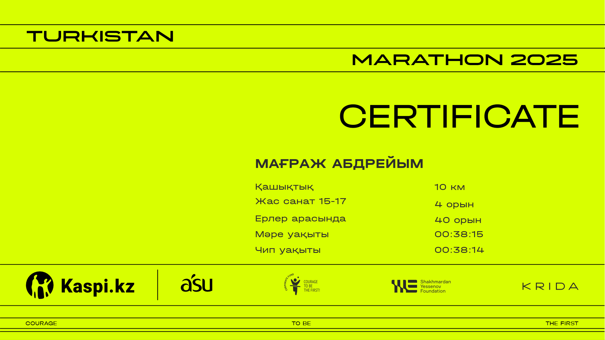 | 51 | Bekzhan Mamytbekov | ![]() | Шымкент | 1540 | 00:23:54 | 00:38:53 | 00:38:48 | Жүктеп алу |