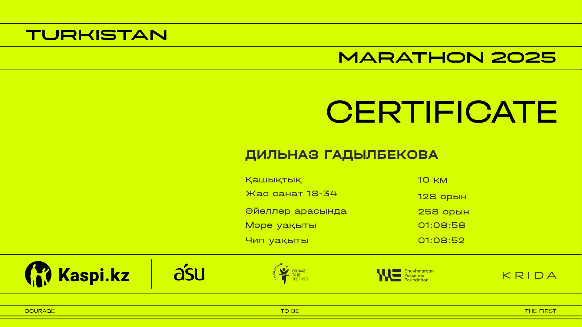 | 866 | Aliya Bitegenova | ![]() | Алматы | 1371 | 00:43:25 | 01:09:23 | 01:08:56 | Жүктеп алу |