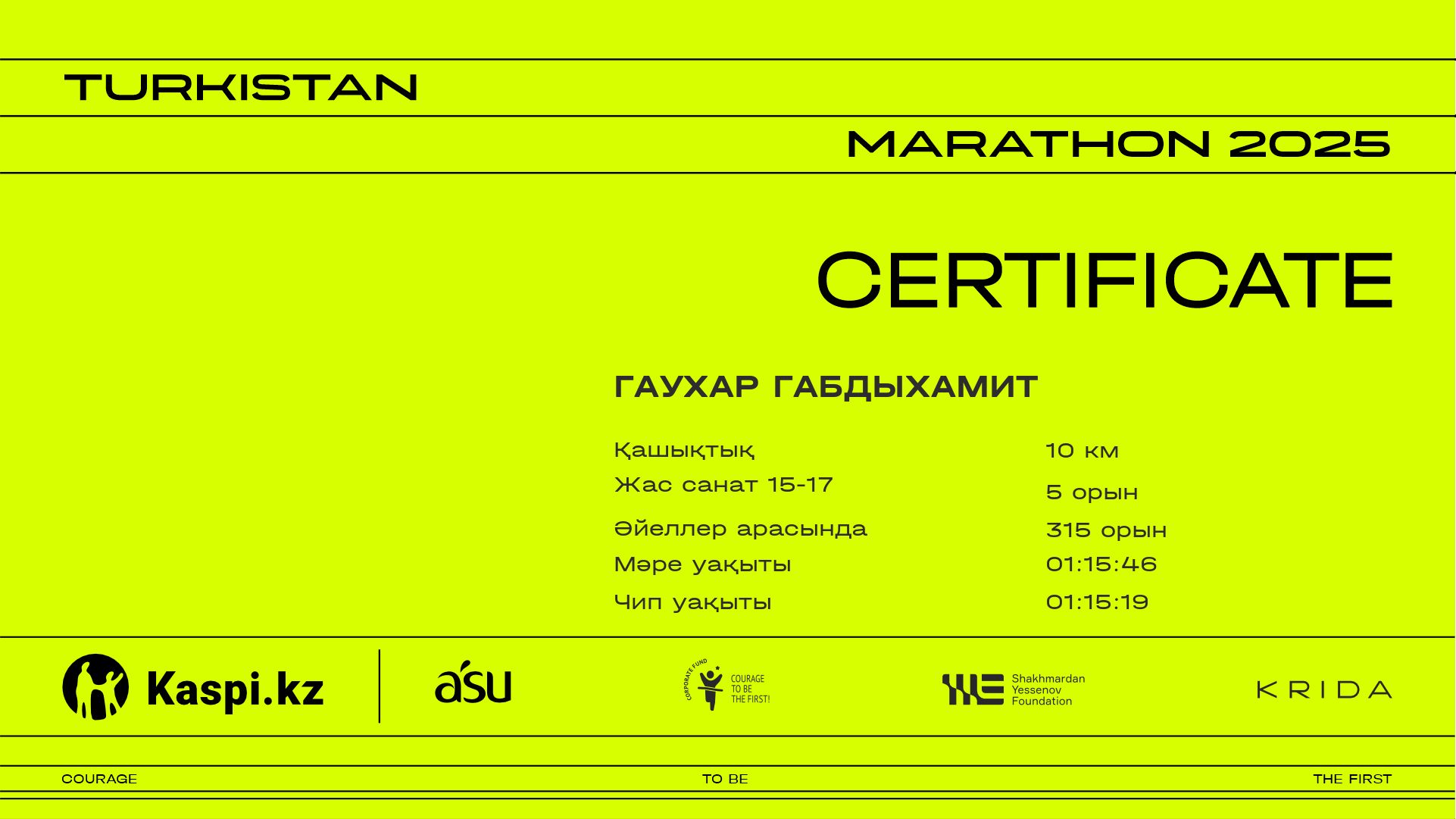 | 1011 | Арайлым Кожанова | ![]() | Алматы | 1300 | 00:48:49 | 01:19:42 | 01:19:11 | Жүктеп алу |