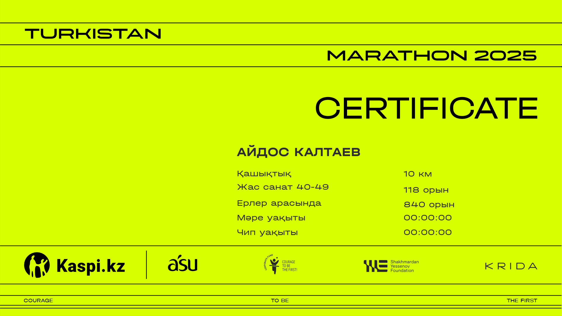 | 729 | Кайыржан Абенов | ![]() | Туркестан | 2130 | 01:04:10 | 01:03:27 | Жүктеп алу | |