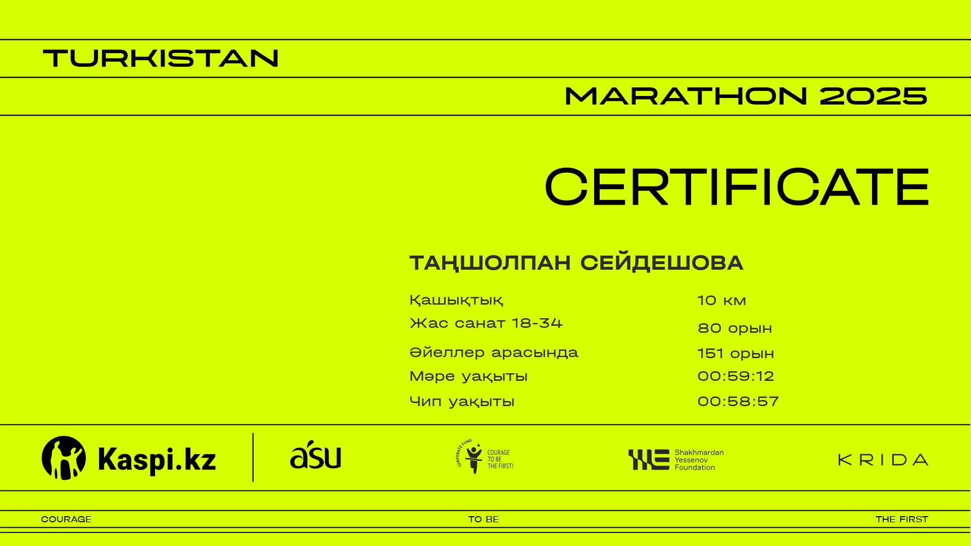 | 1117 | Снежана Ачкасова | ![]() | Алматы | 1160 | 00:58:21 | 01:34:15 | 01:33:37 | Жүктеп алу |