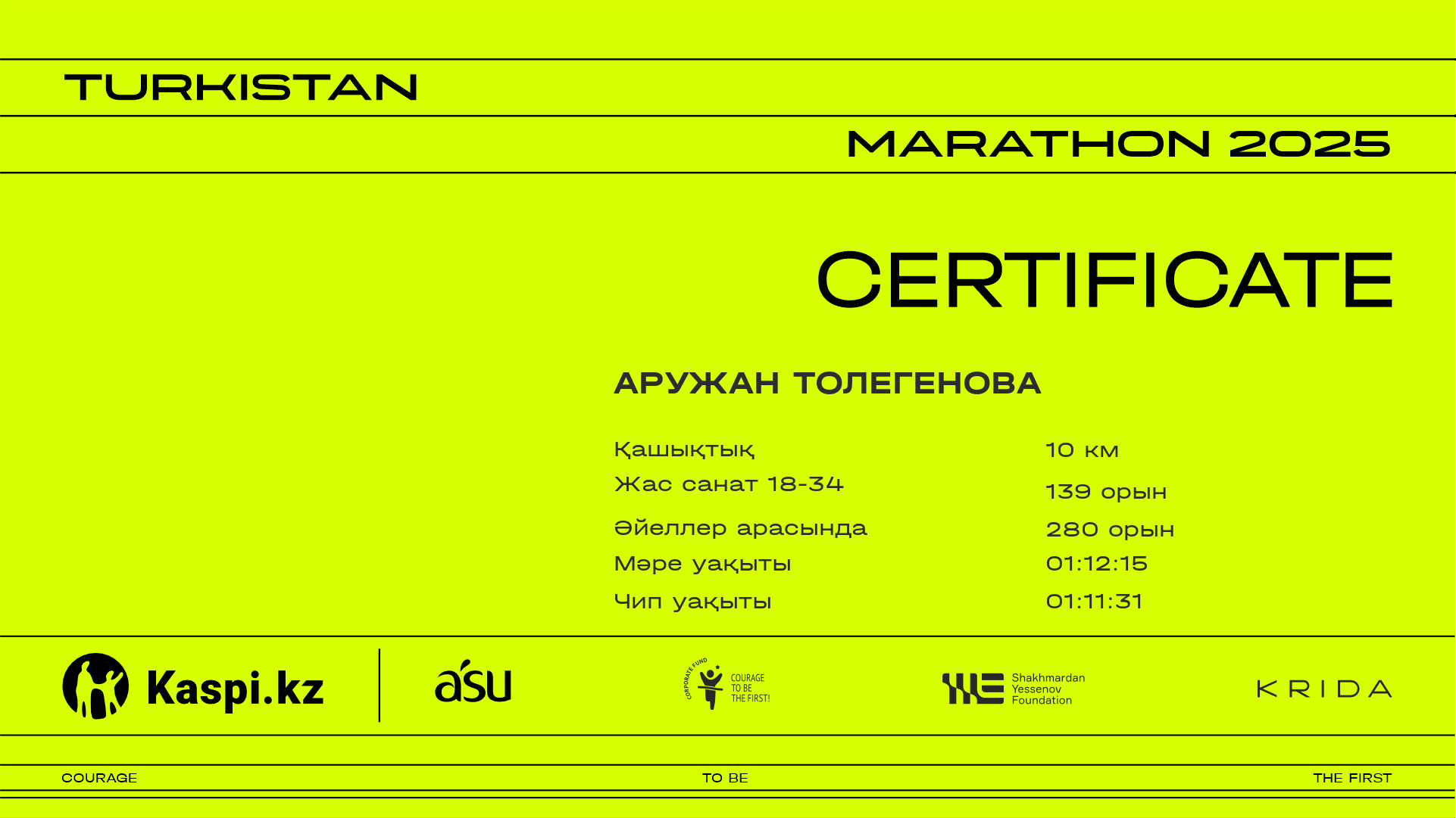 | 940 | Камила Дедёкина | ![]() | Алматы | 1219 | 00:47:33 | 01:14:35 | 01:13:44 | Жүктеп алу |
