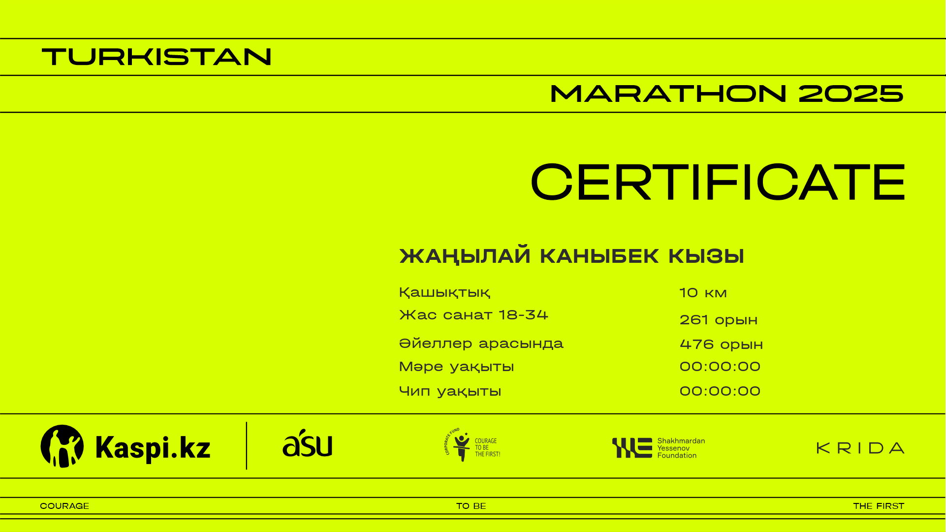 | 1015 | Аида Оралбек | ![]() | Алматы | 1262 | 00:49:56 | 01:20:00 | 01:19:17 | Жүктеп алу |