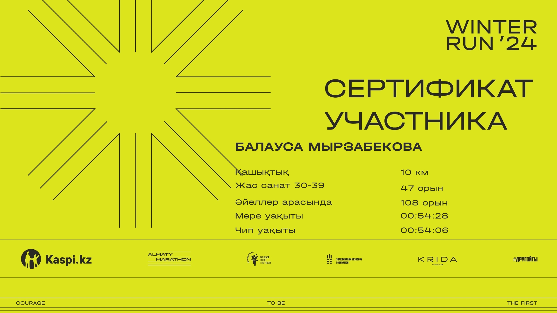 | 650 | Балауса Мырзабекова | ![]() | Алматы | 1248 | 00:08:35 | 00:28:08 | 00:45:53 | 00:54:28 | 00:54:06 | Жүктеп алу |