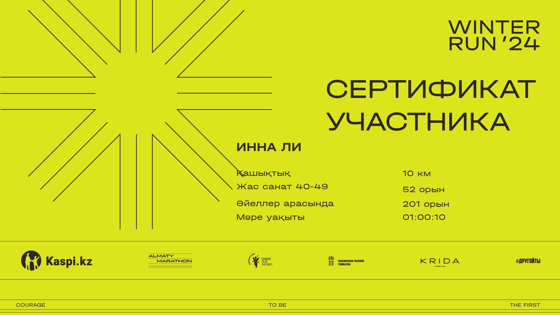 | 1611 | Галия Тастемирова | ![]() | Алматы | 1719 | 00:11:24 | 00:40:23 | 01:04:59 | 01:17:36 | 01:16:50 | Жүктеп алу |