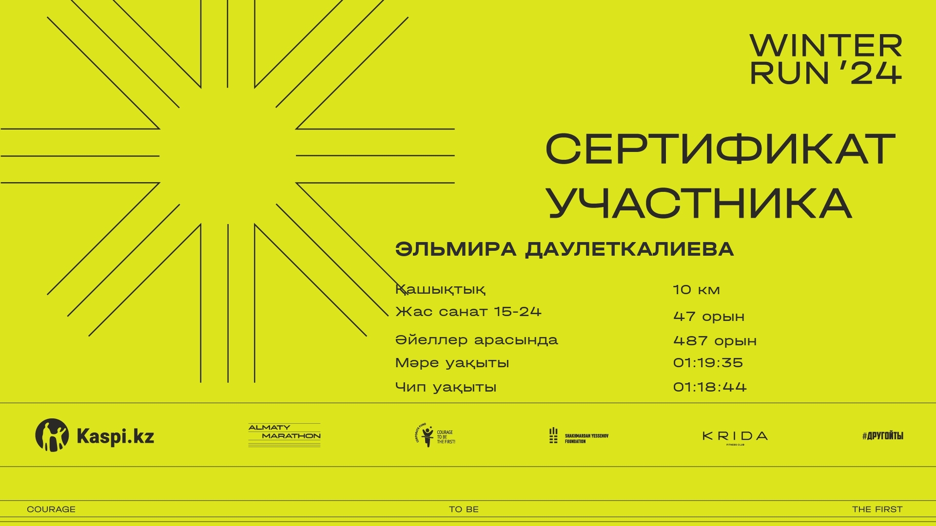 | 1654 | Эльмира Даулеткалиева | ![]() | Алматы | 241 | 00:11:52 | 00:40:41 | 01:07:16 | 01:19:35 | 01:18:44 | Жүктеп алу |