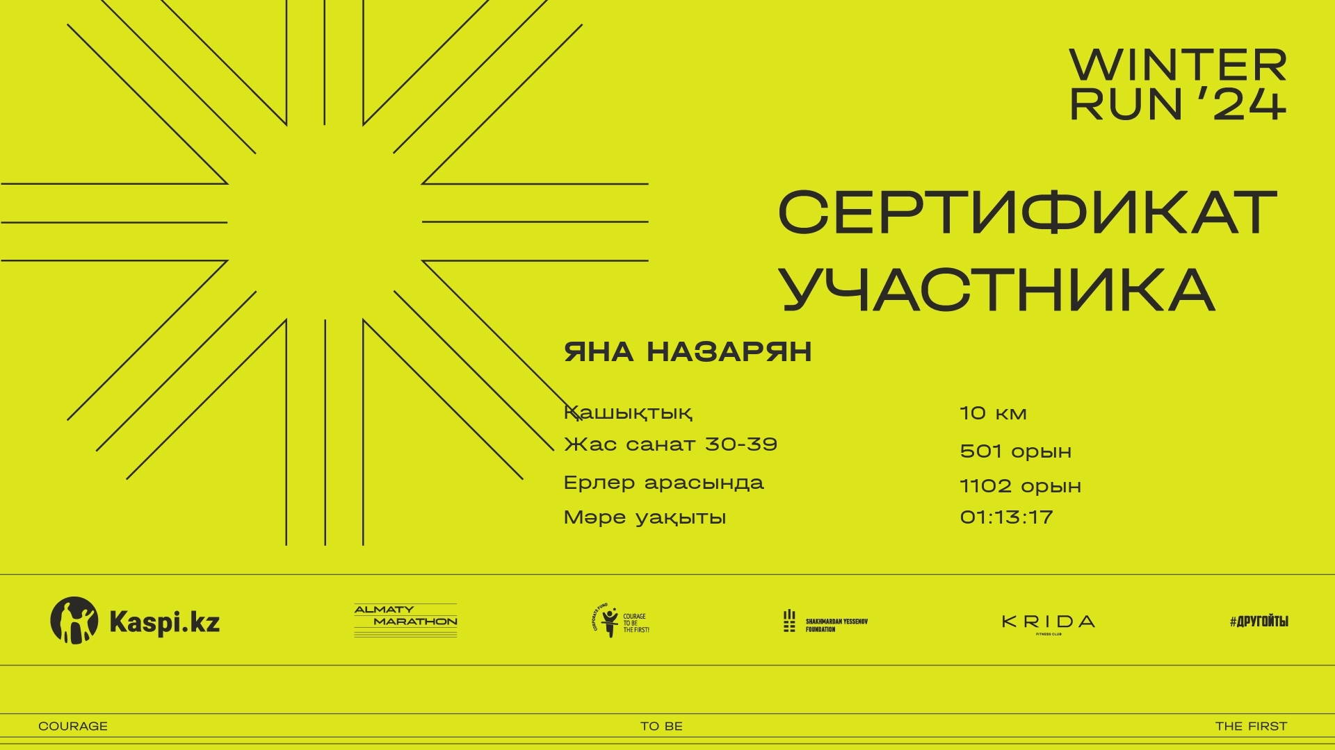 | 833 | Юлия Ким | ![]() | Алматы | 1367 | 00:08:45 | 00:29:36 | 00:48:20 | 00:57:31 | 00:57:05 | Жүктеп алу |
