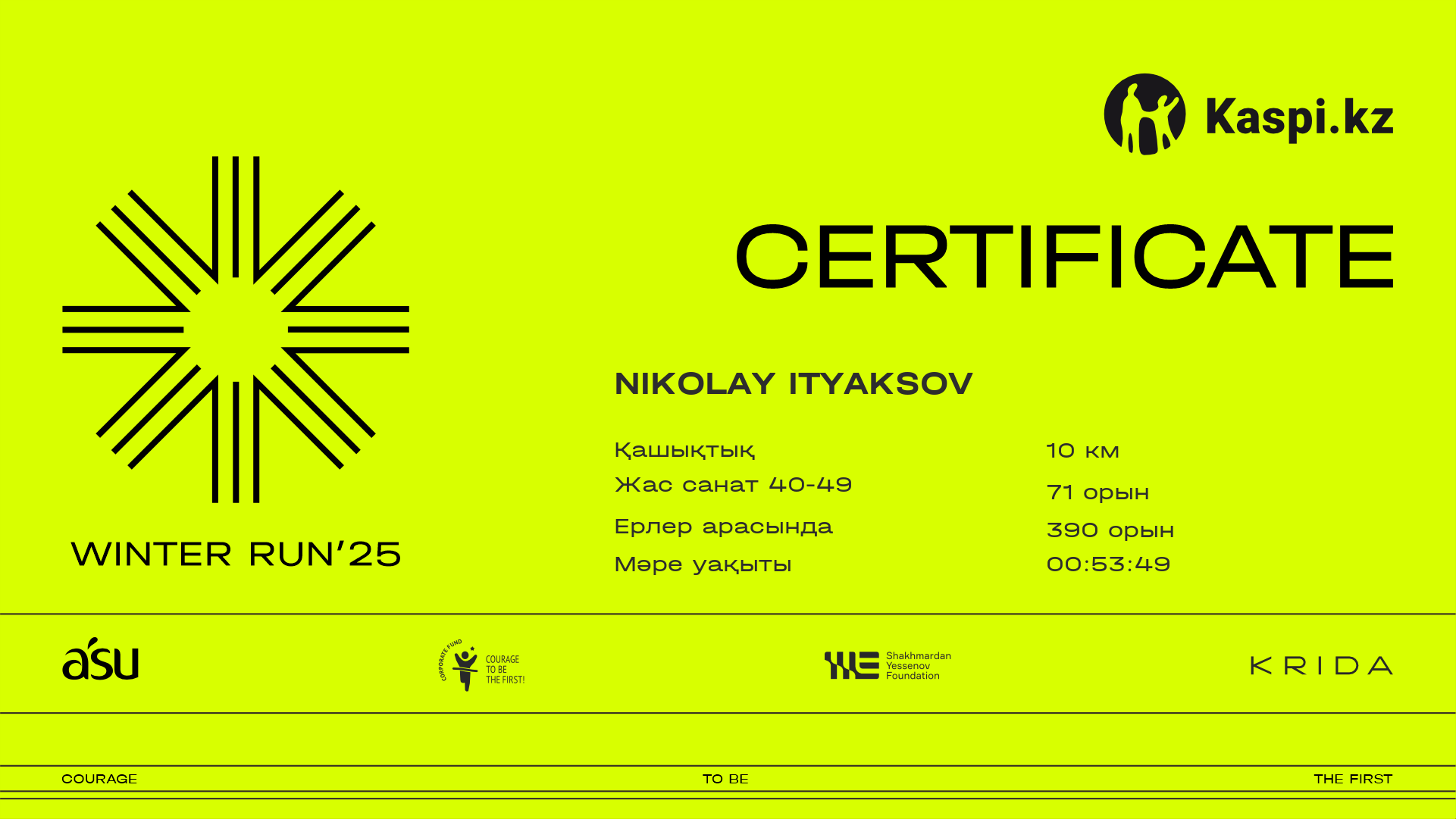 ОрынҚатысушыЕлҚалаНөмір4.2 km7.4 kmФинишУақыт чипіСертификат