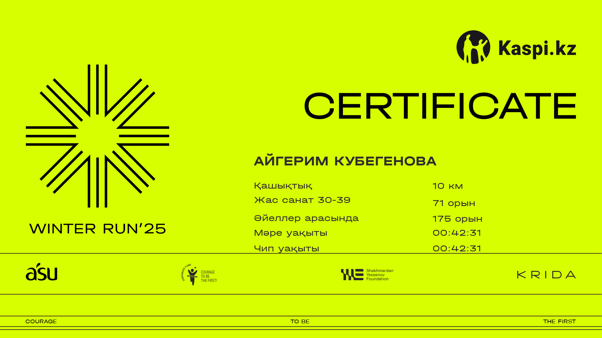 | 1534 | Айгерим Кайсенова | ![]() | Алматы | 778 | 00:33:52 | 01:01:18 | 01:25:23 | 01:24:16 | Жүктеп алу |