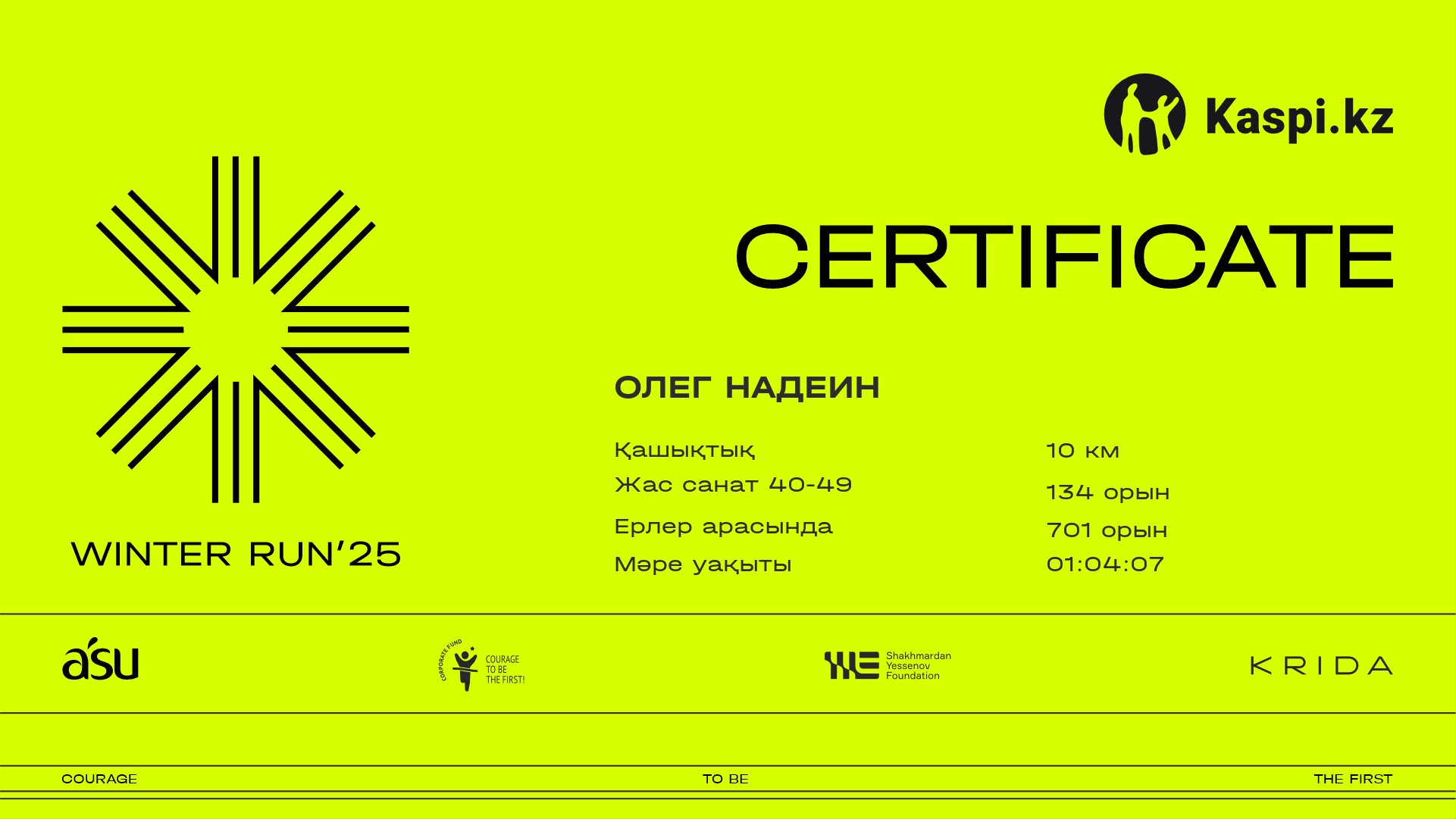 | 946 | Олег Надеин | ![]() | Алматы | 1478 | 00:26:21 | 00:46:01 | 01:04:07 | 01:03:07 | Жүктеп алу |