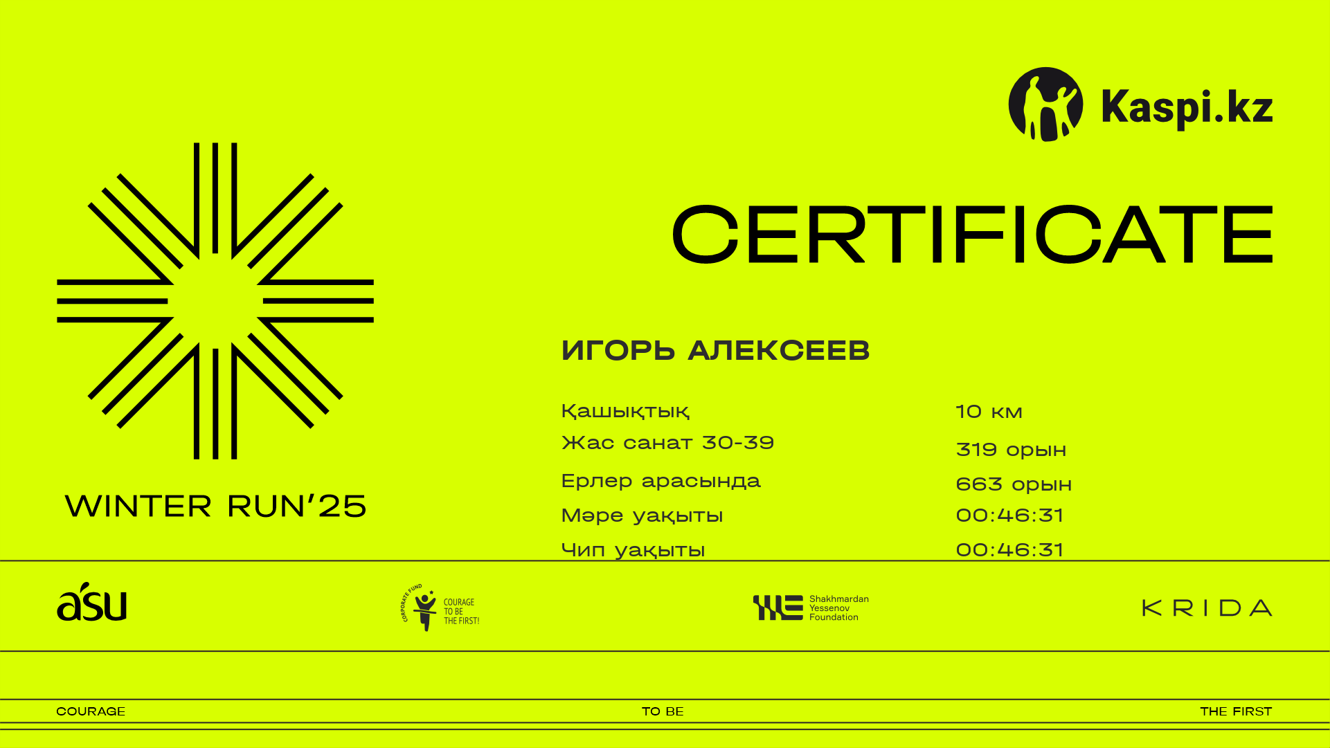 | 865 | Aidar Yeraliyev | ![]() | Алматы | 392 | 00:23:05 | 00:43:42 | 01:01:42 | 01:01:25 | Жүктеп алу |