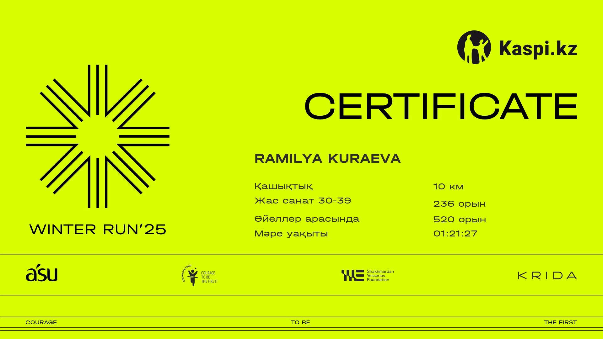 | 1472 | Ramilya Kuraeva | ![]() | Алматы | 1227 | 00:31:46 | 00:58:04 | 01:21:27 | 01:19:38 | Жүктеп алу |
