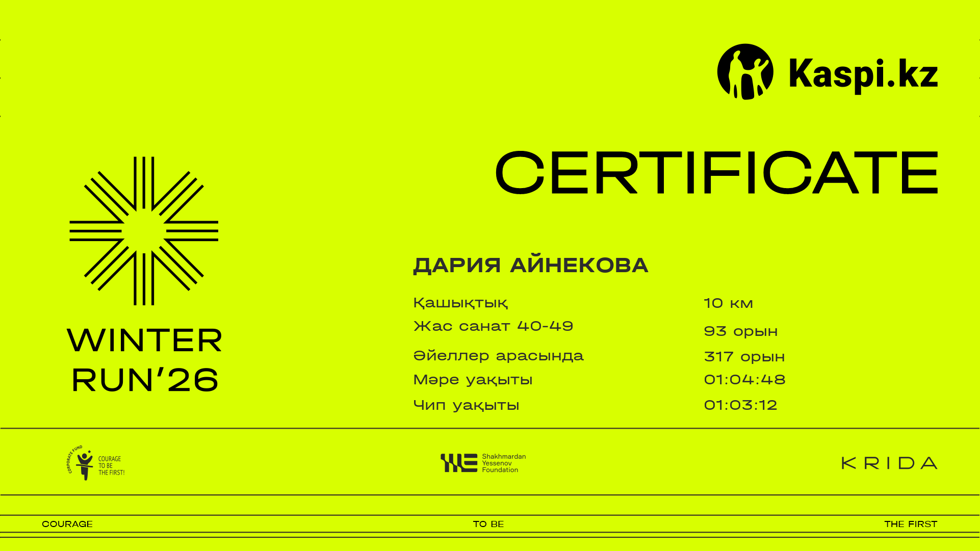 | 1358 | Assel Kulybekova | ![]() | Almaty | 1863 | 00:11:12.31 | 00:34:58.72 | 00:55:08.01 | 01:04:53.18 | 01:03:12.09 | Жүктеп алу |