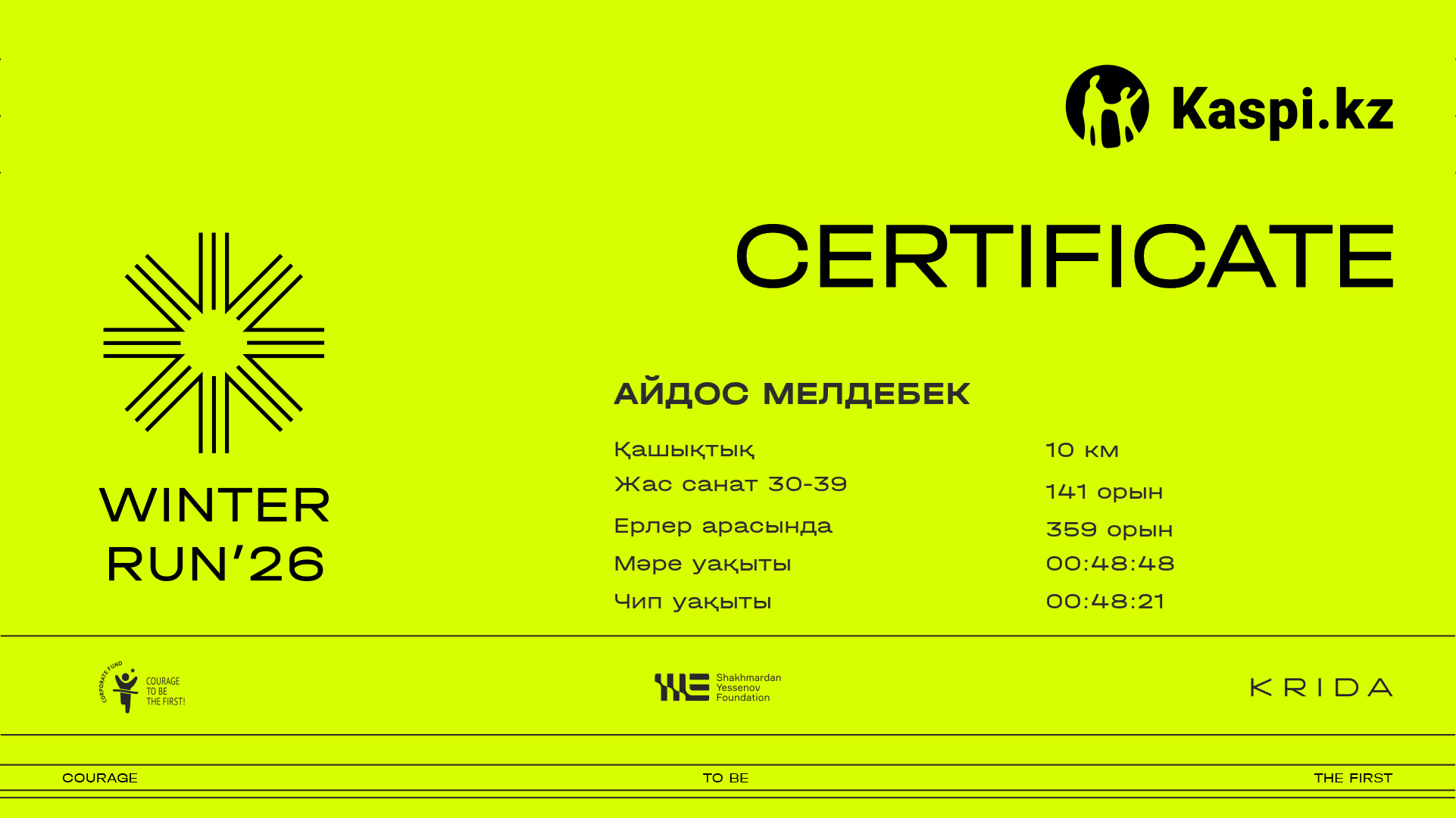 | 400 | Асем Утелбаева | ![]() | Алматы | 1449 | 00:07:23.12 | 00:25:14.63 | 00:41:30.29 | 00:48:43.35 | 00:48:28.97 | Жүктеп алу |