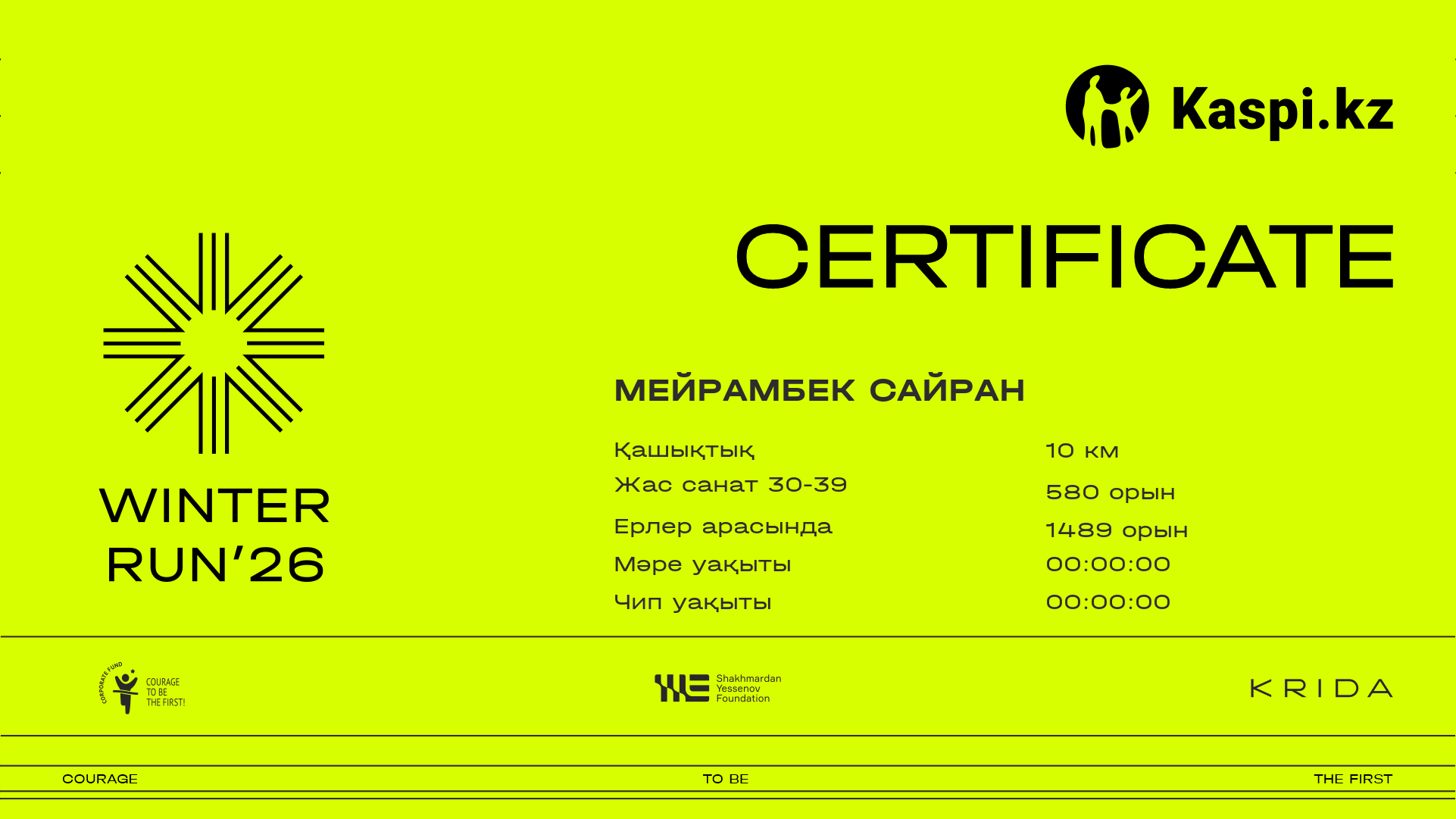 | Орын | Қатысушы | Ел | Қала | Нөмір | 1.5 km | 5 km | 8.5 km | Финиш | Уақыт чипі | Сертификат |