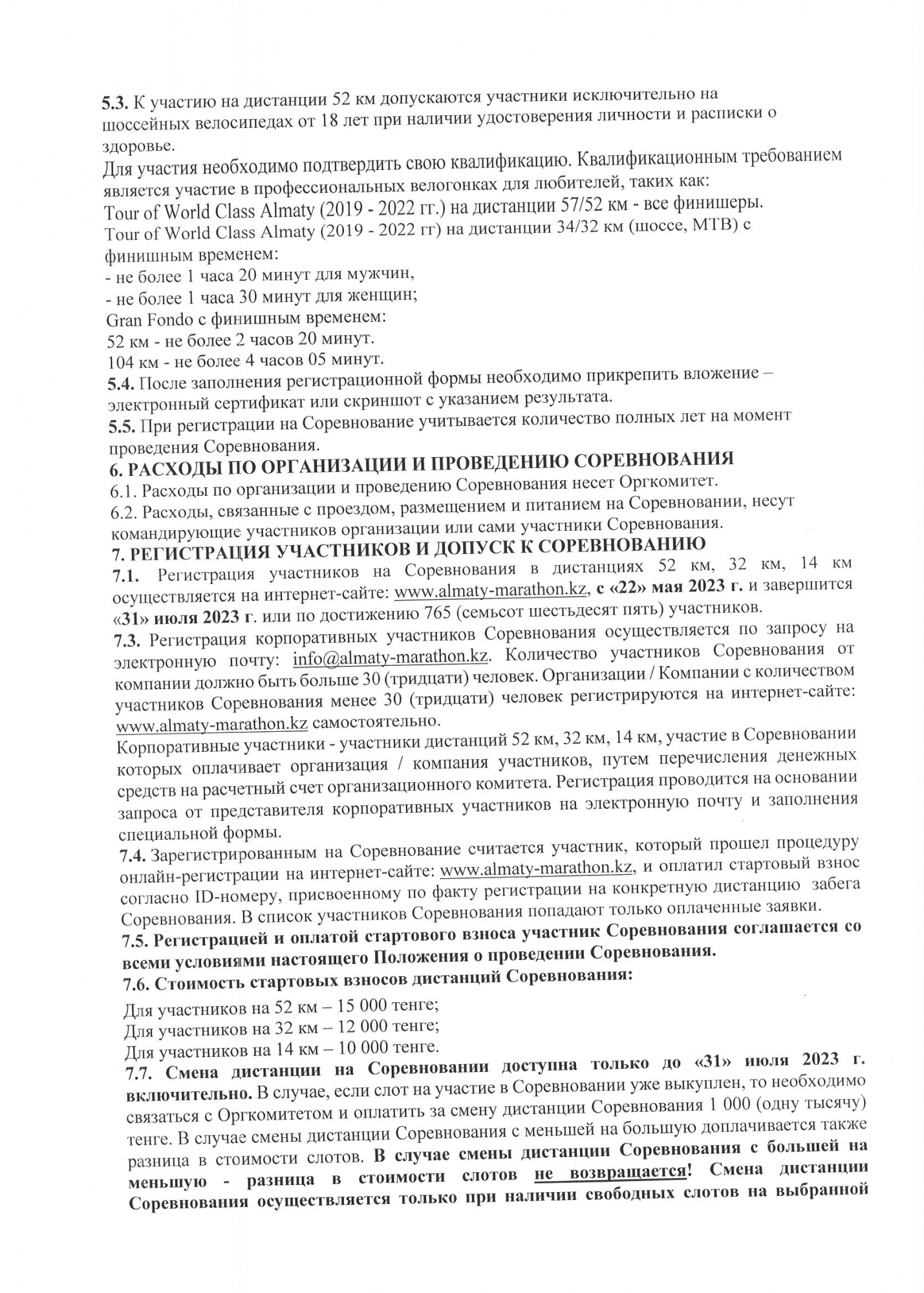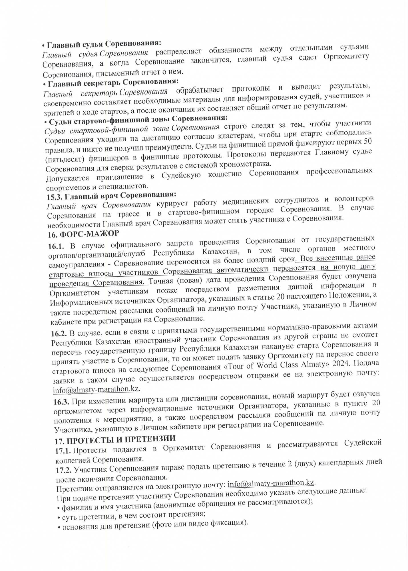 16.2. В случае, если в связи с принятыми государственными нормативно-правовыми актами Республики Казахстан иностранный участник Соревнования из другой страны не сможет пересечь государственную границу Республики Казахстан накануне старта Соревнования и принять участие в Соревновании, то он может подать заявку Оргкомитету на перенос своего стартового взноса на следующее Соревнования «Tour of World Class Almaty» 2024. Подача заявки в таком случае осуществляется посредством отправки ее на электронную почту: info@almaty-marathon.kz.