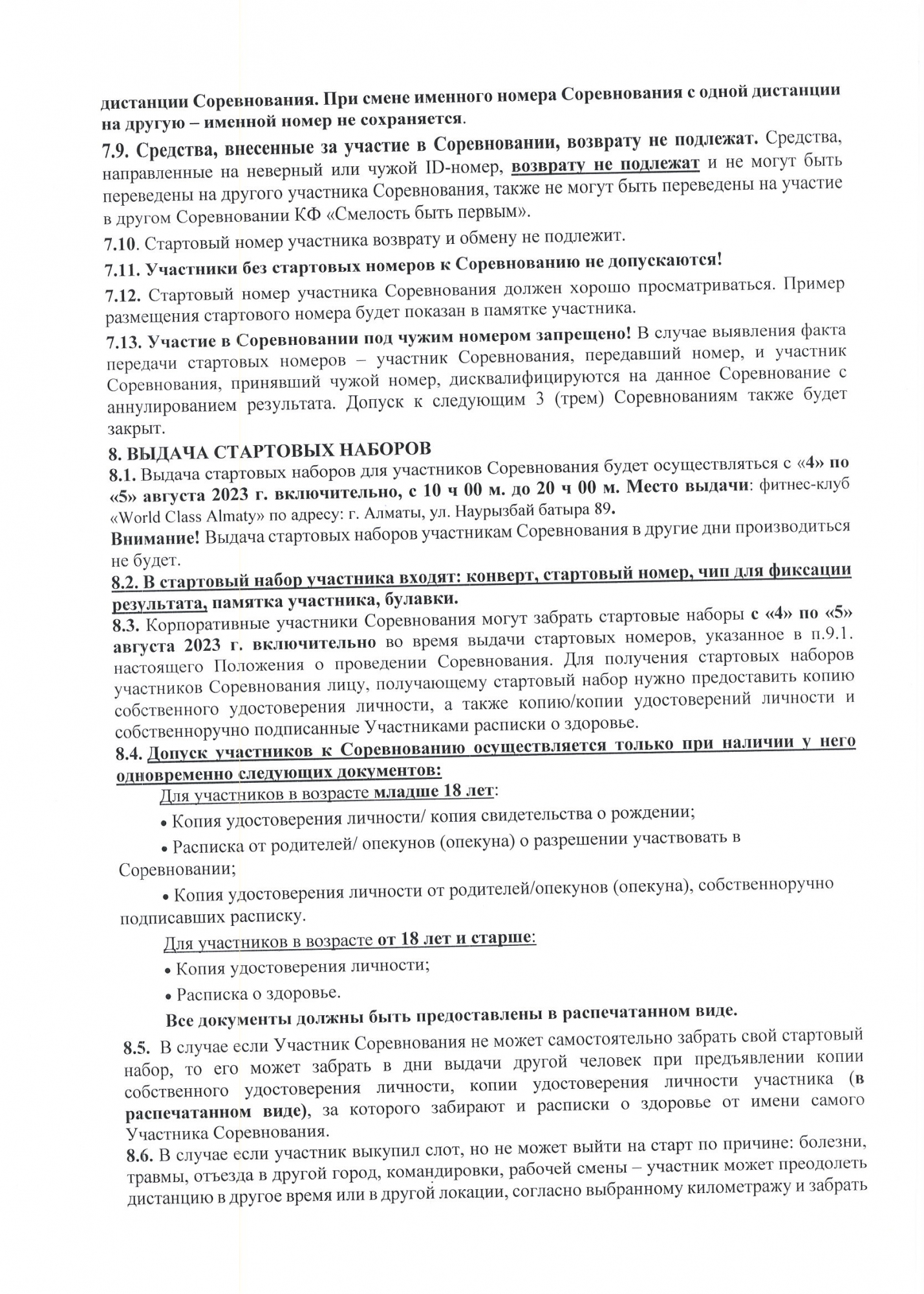7.7. Смена дистанции на Соревновании доступна только до «31» июля 2023 г. включительно. В случае, если слот на участие в Соревновании уже выкуплен, то необходимо связаться с Оргкомитетом и оплатить за смену дистанции Соревнования 1 000 (одну тысячу) тенге. В случае смены дистанции Соревнования с меньшей на большую доплачивается также разница в стоимости слотов. В случае смены дистанции Соревнования с большей на меньшую - разница в стоимости слотов не возвращается! Смена дистанции Соревнования осуществляется только при наличии свободных слотов на выбранной дистанции Соревнования. При смене именного номера Соревнования с одной дистанции на другую - именной номер не сохраняется.