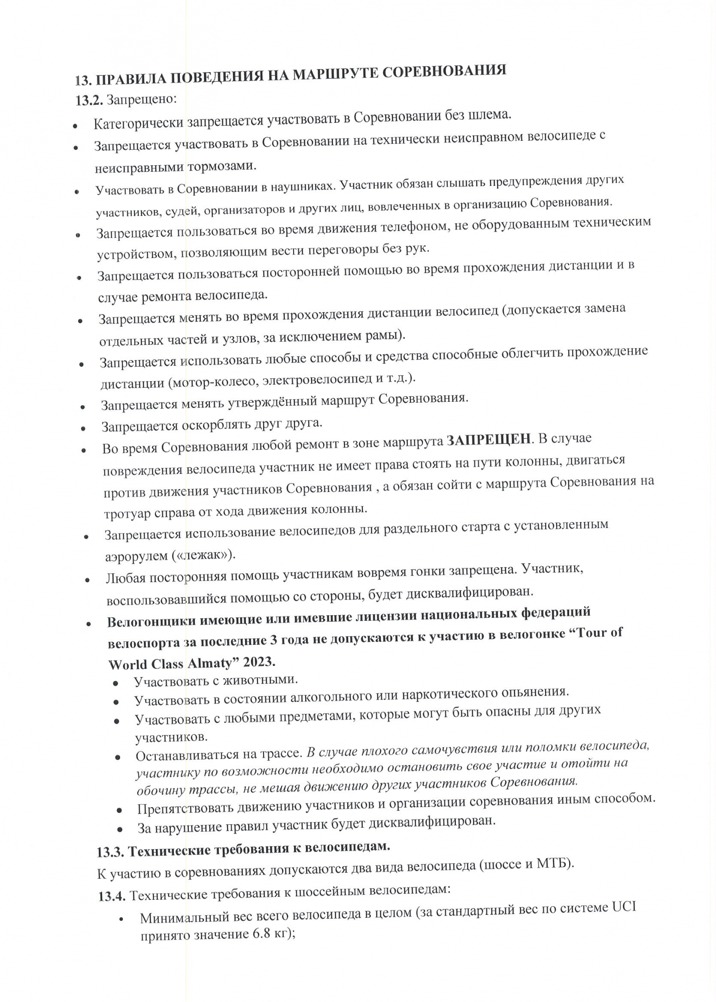 •Велогонщики имеющие или имевшие лицензии национальных федераций велоспорта за последние 3 года не допускаются к участию в велогонке "Tour of World Class Almaty" 2023.