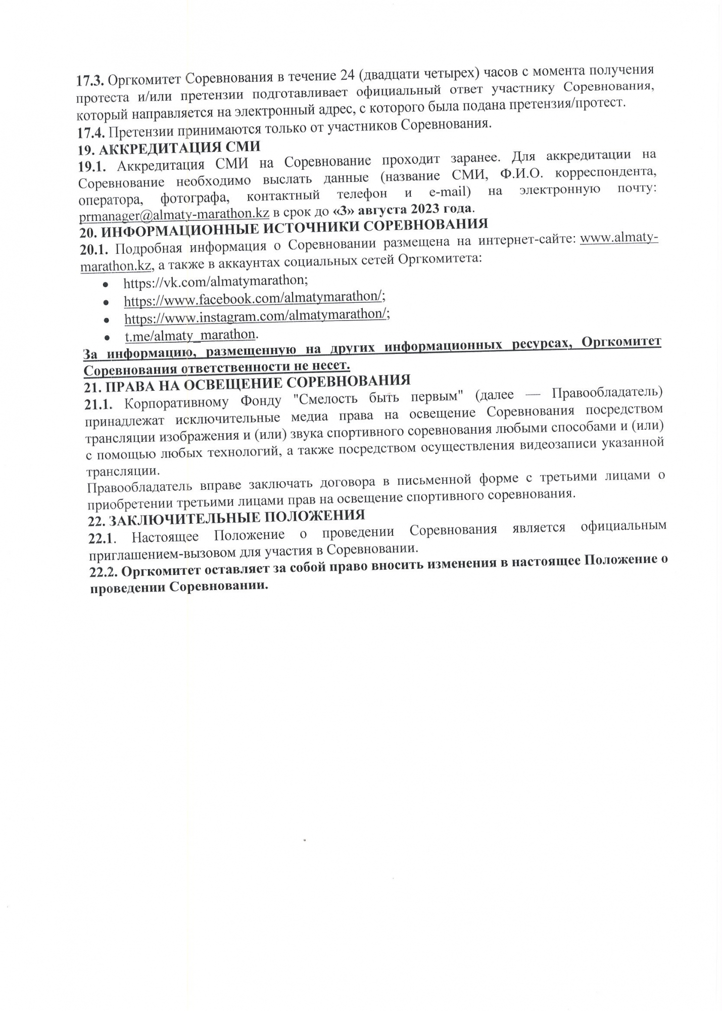 19.1. Аккредитация СМИ на Соревнование проходит заранее. Для аккредитации на Соревнование необходимо выслать данные (название СМИ, Ф.И.О. корреспондента,  оператора, фотографа, контактный телефон и e-mail) на электронную почту: prmanager@almaty-marathon.kz в срок до «3» августа 2023 года.