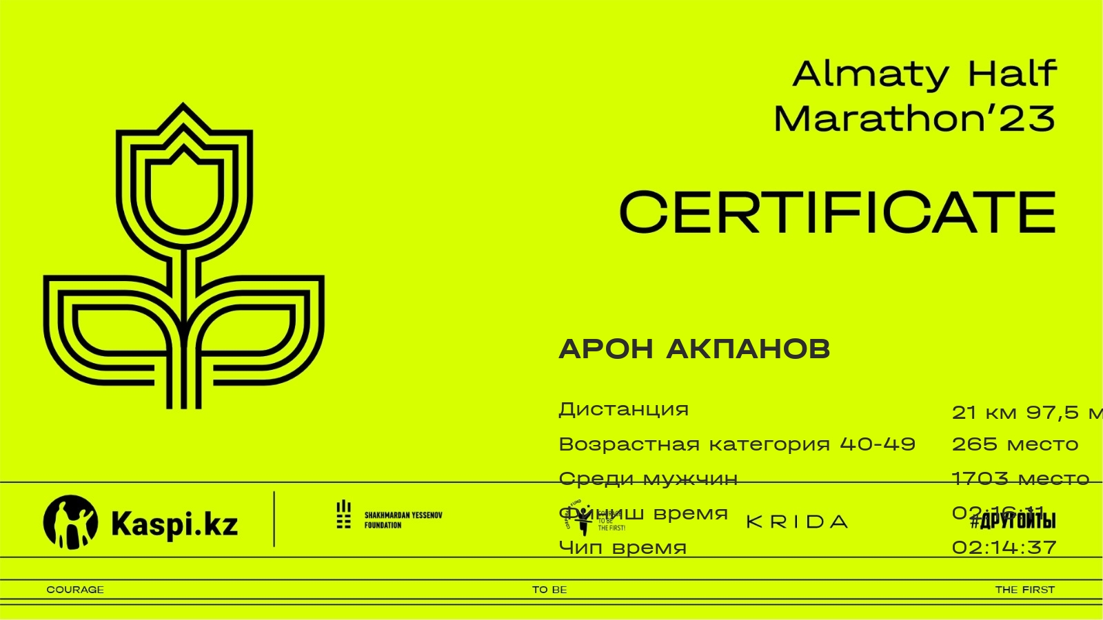 | 2224 | Баглан Досым | ![]() | Алматы | 1837 | 00:36:07.66 | 01:11:20.06 | 01:42:15.24 | 02:22:42.94 | 02:20:47.82 | Скачать | |
