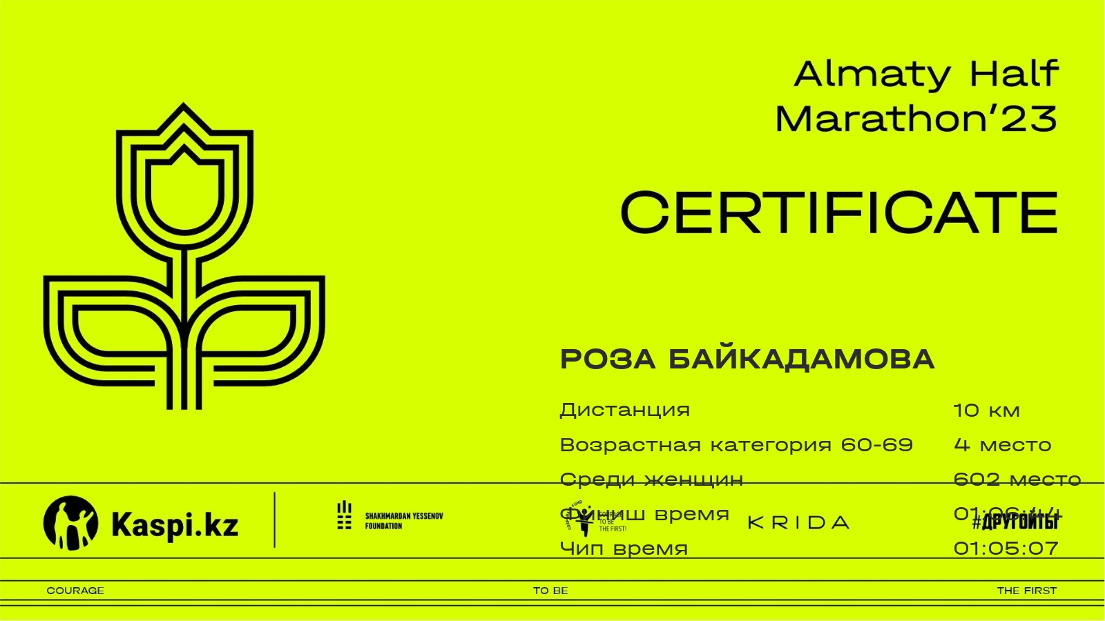 | 2034 | Дарья Безъязычных | ![]() | Алматы | 4149 | 00:46:26.77 | 01:07:46.78 | 01:05:01.19 | Скачать |