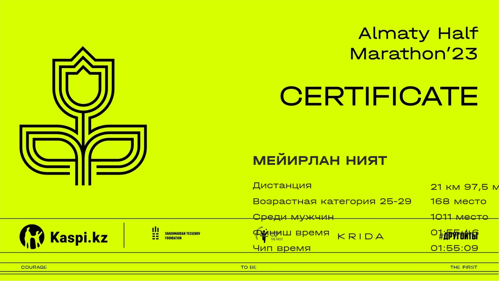 | 1925 | Мейр Баяхметов | ![]() | Алматы | 2616 | 00:25:52.69 | 00:57:30.01 | 01:28:54.56 | 02:06:37.65 | 02:14:33.24 | 02:14:13.87 | Скачать |